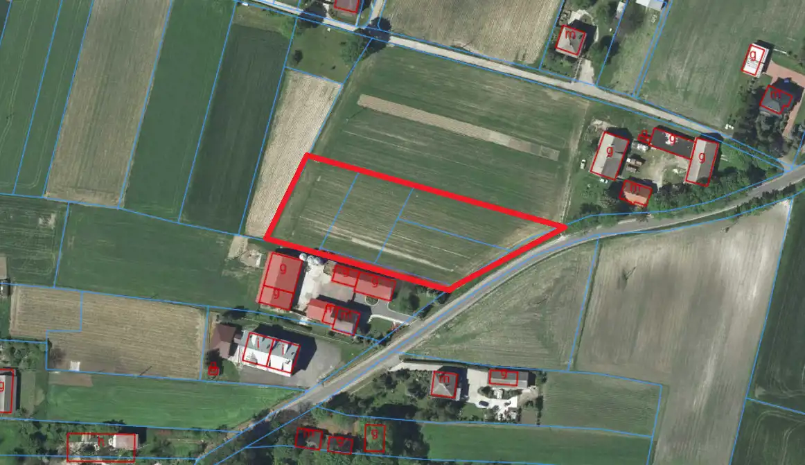 Działka ma kształt nieregularny o wymiarach 60x118x43x85 m i dostęp do asfaltowej drogi gminnej. Działka podzielona na 4 mniejsze działki pod ewentualną zabudową ę jednorodzinną i wewnętrzną drogę dojazdową.