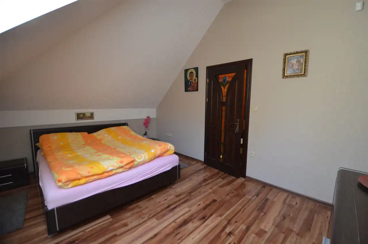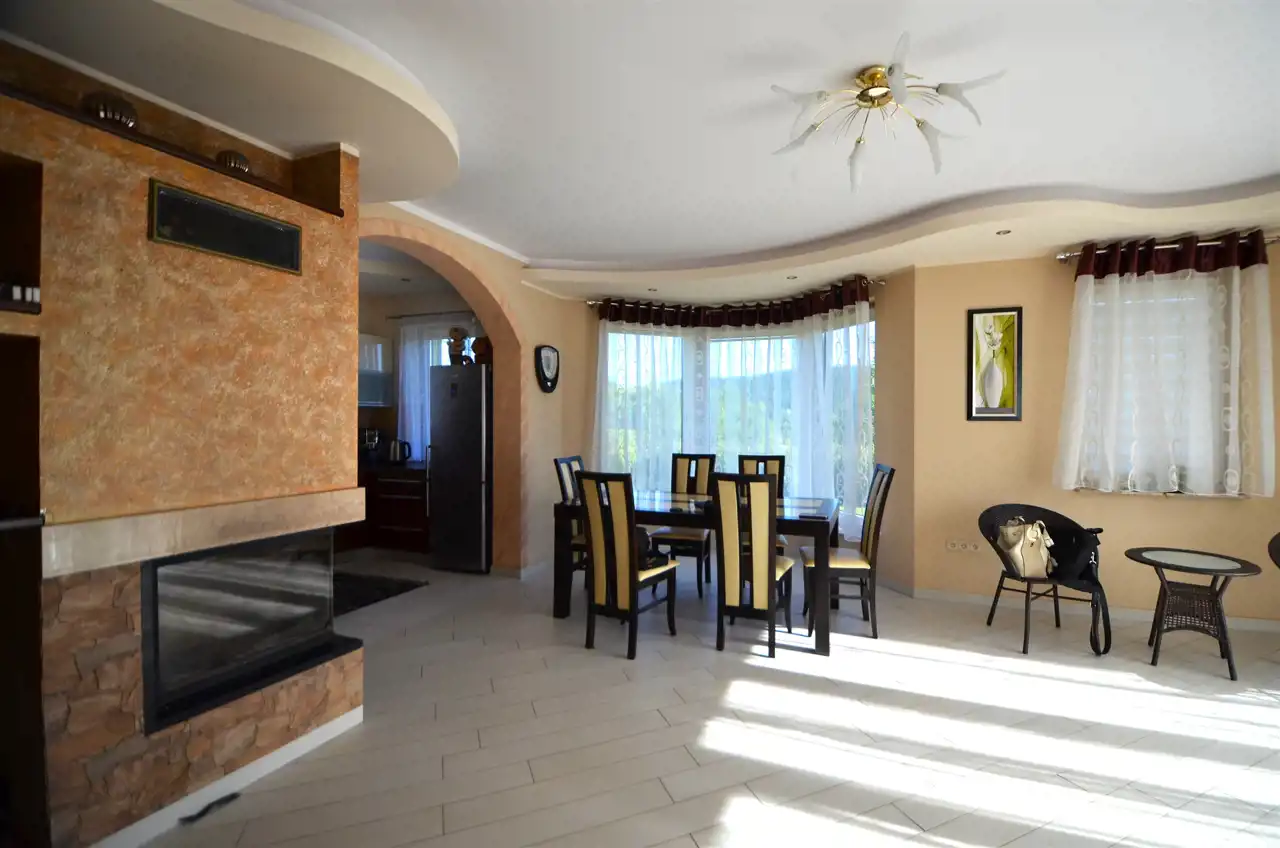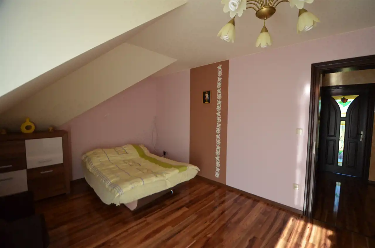 Piękny dom wybudowany metodą tradycyjną w 2014 roku, pokryty dachówką ceramiczną w kolorze grafitu oraz wykończony blachą stalową w tym samym kolorze. Ściany zewnętrzne wykończone tynkiem cienkowarstwowym, paroprzepuszczalnym w jasnym żółtym kolorze, wewnętrzne tradycyjnym tynkiem cementowo-wapiennym oraz pomalowane farbami klejowymi. W pokojach i sypialniach znajduje się mozaika lub parkiet dębowy, a w dwóch łazienkach, każda z WC, na parterze z prysznicem, a na piętrze z wanną oraz w kuchni płytki ceramiczne, antypoślizgowe. Do dyspozycji znajduje się także garaż z pomieszczeniem gospodarczym, w którym jest kotłownia. Stolarka okienna w kolorze ciemnego dębu, brama garażowa oraz drzwi zewnętrzne z twardego klejonego dębu, dodają eleganckiego wyglądu elewacji. Dom jest podpięty do wodociągu, a ciepła woda jest dostarczana z elektrycznego, przepływowego podgrzewacza.