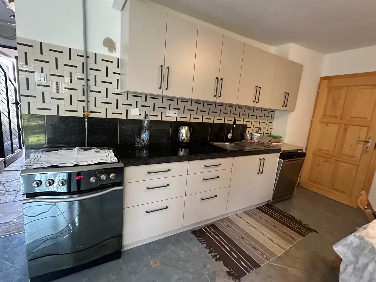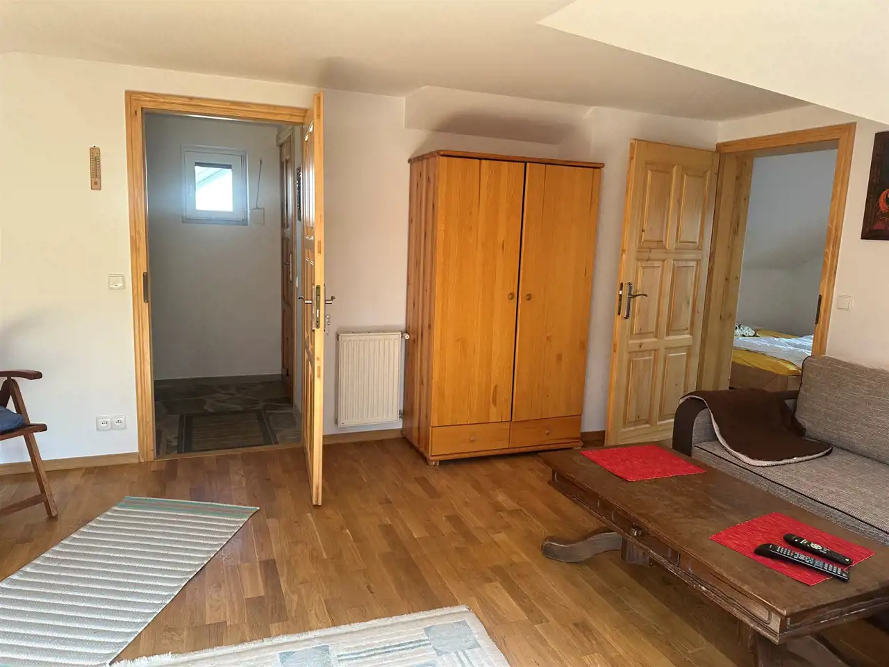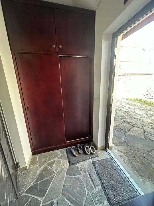 Na parterze znajduje się duża, przestronna, jasna kuchnia z bezpośrednim wyjściem do ogrodu. Kuchnia umeblowana i wyposażona. Łazienka na parterze z wc, prysznicem i pralką. Dodatkowo długi korytarz oraz pomieszczenie gospodarcze – kotłownia. Na poddaszu pokój z wyjściem na balkon z widokiem na ogród, pokój z balkonem francuskim oraz łazienka z wc i wanną.
