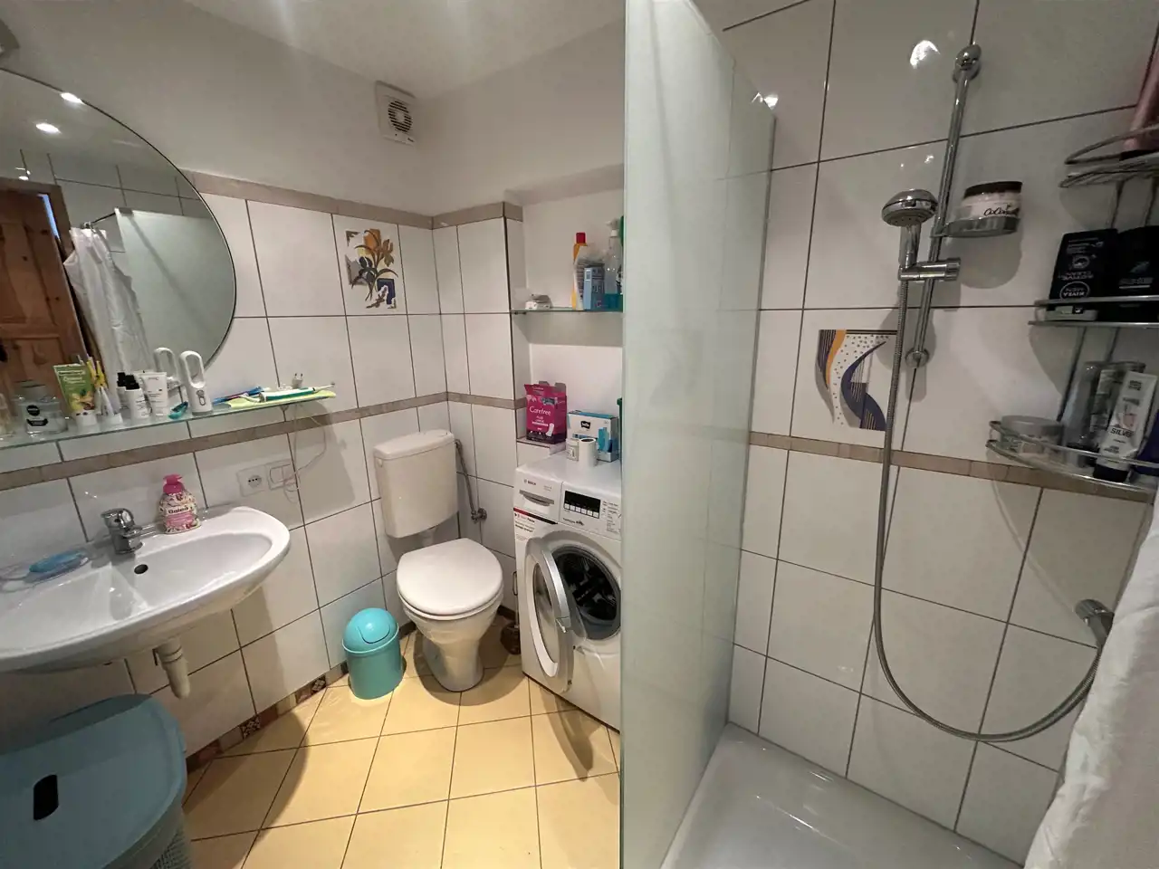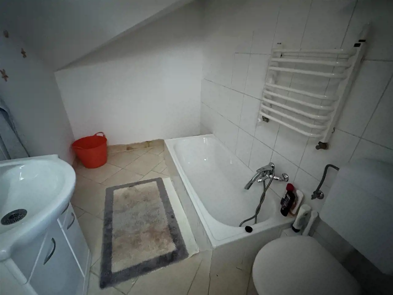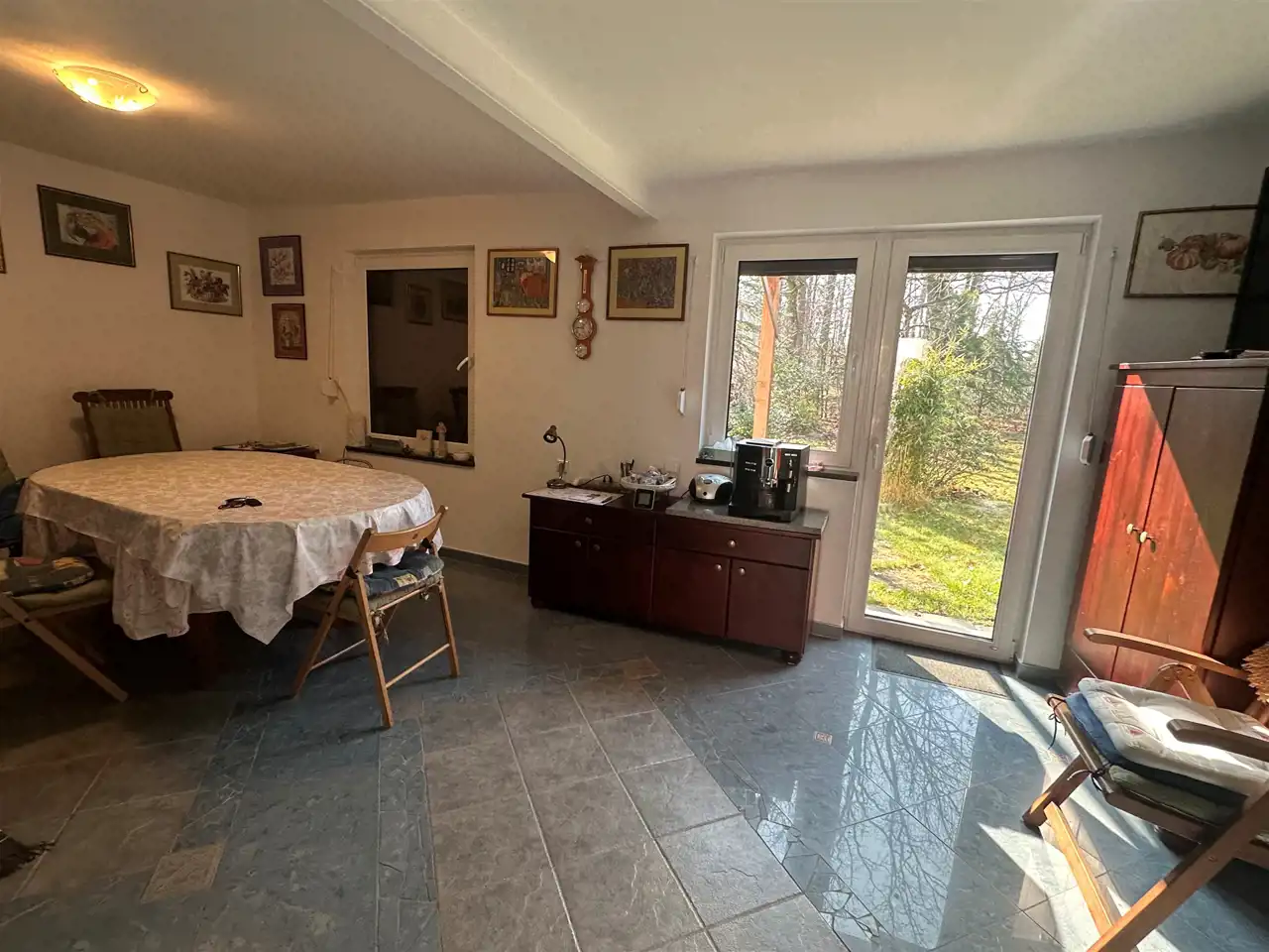 Na parterze znajduje się duża, przestronna, jasna kuchnia z bezpośrednim wyjściem do ogrodu. Kuchnia umeblowana i wyposażona. Łazienka na parterze z wc, prysznicem i pralką. Dodatkowo długi korytarz oraz pomieszczenie gospodarcze – kotłownia. Na poddaszu pokój z wyjściem na balkon z widokiem na ogród, pokój z balkonem francuskim oraz łazienka z wc i wanną.