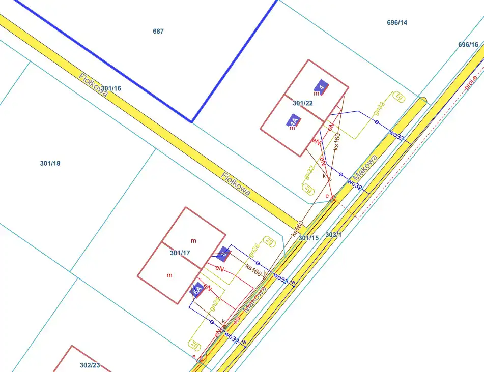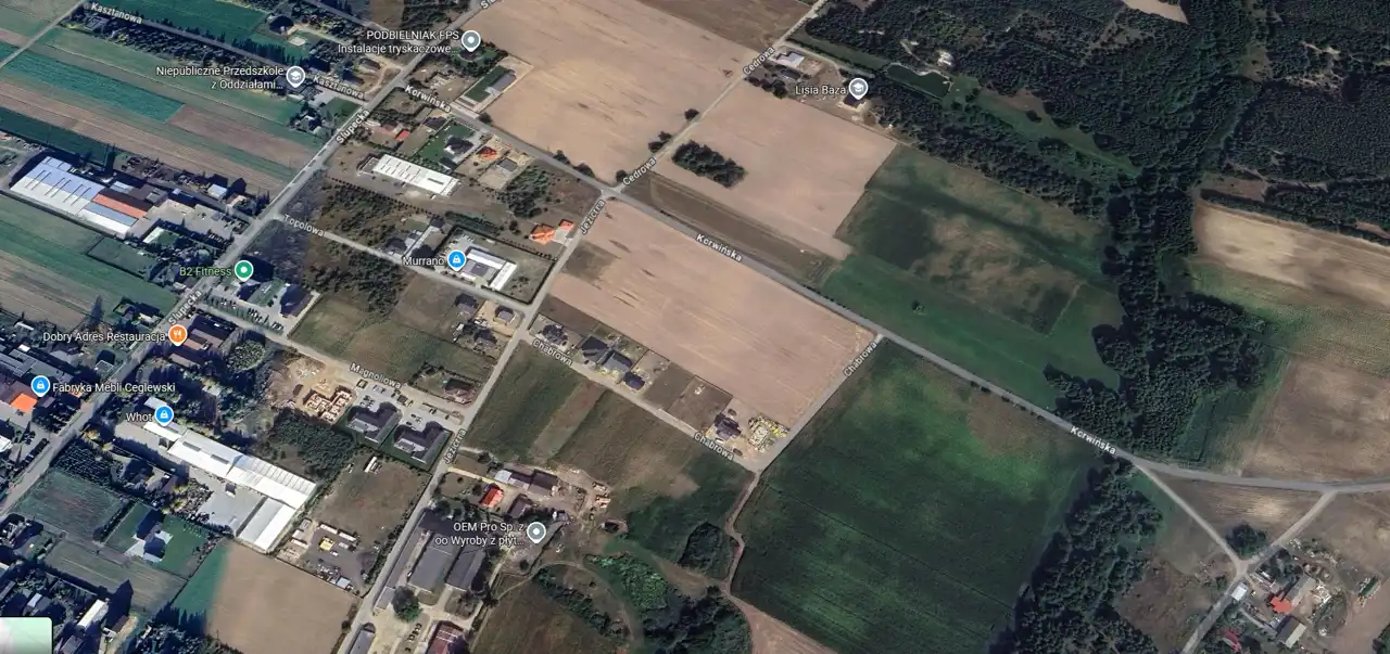 - kanalizacja - w ulicy Makowej (30 m od działki)