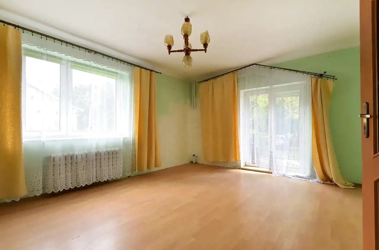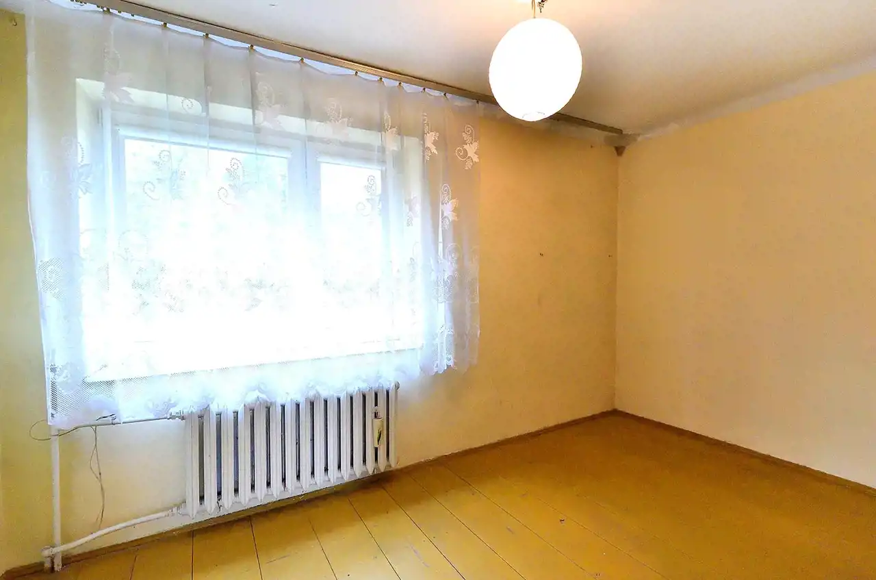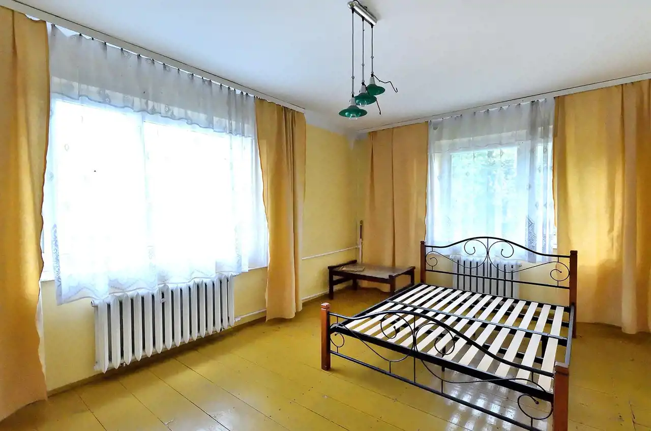 The house requires renovation. Wooden floors, roof covered with roofing felt. The property is connected to the municipal water and sewage system. On the plot, there is also a carport and an outbuilding. The plot is flat, fenced, and located along an asphalt road.