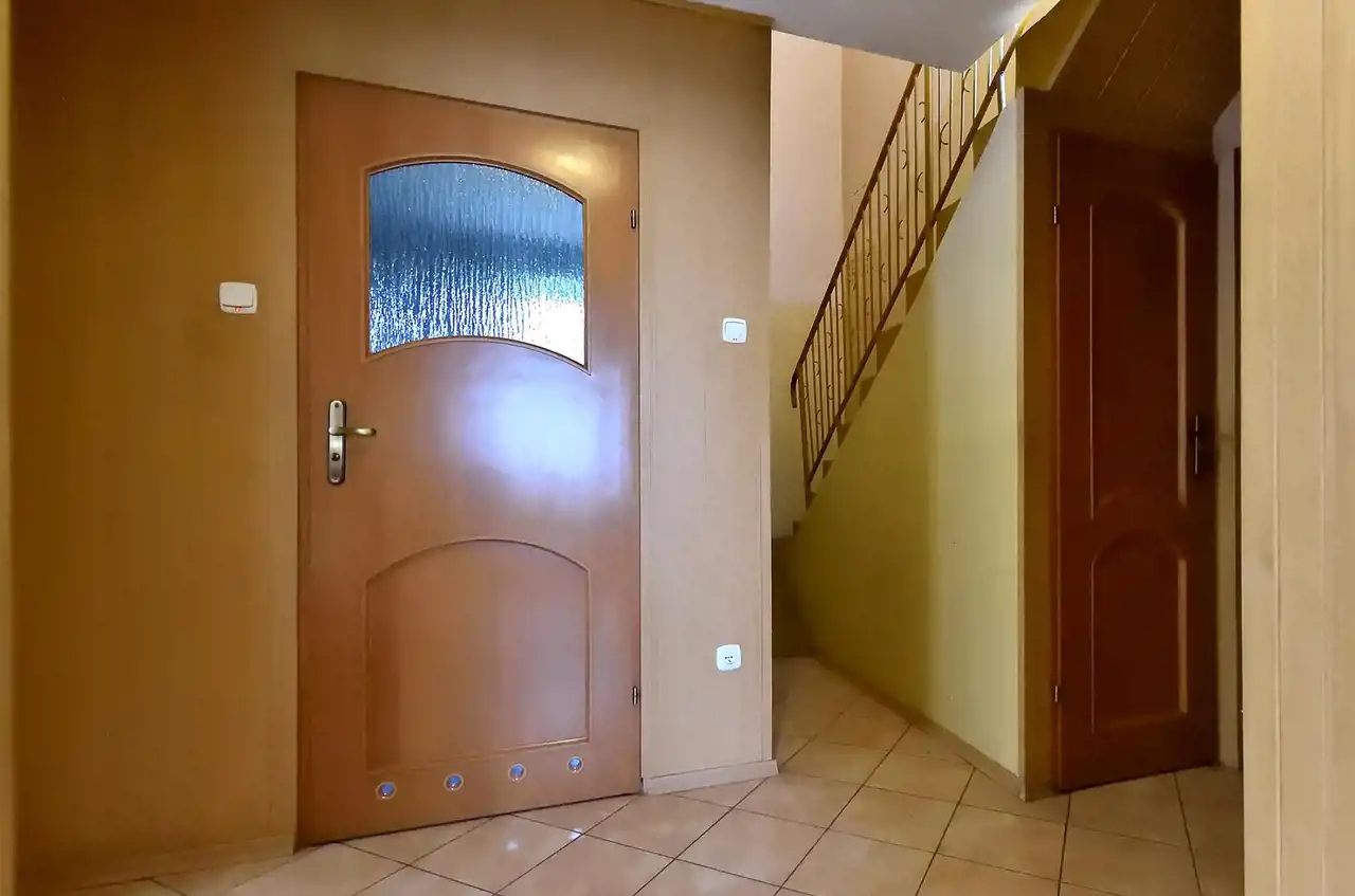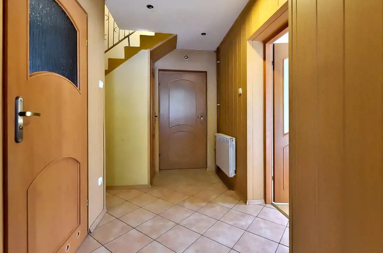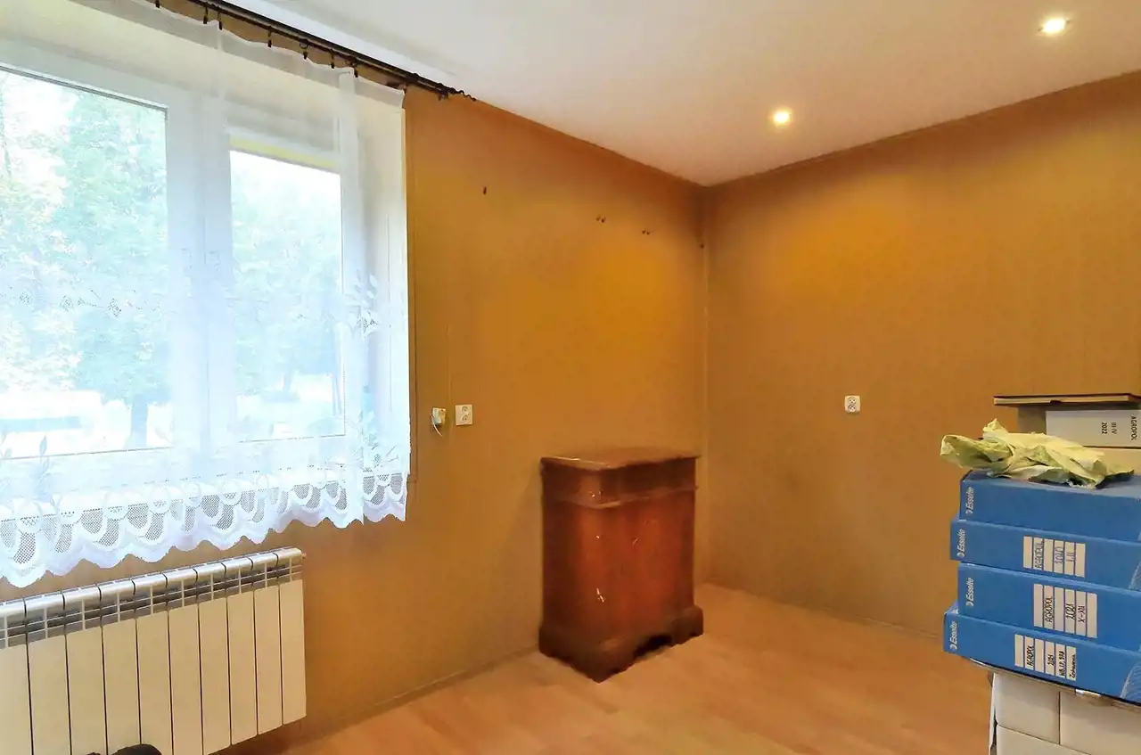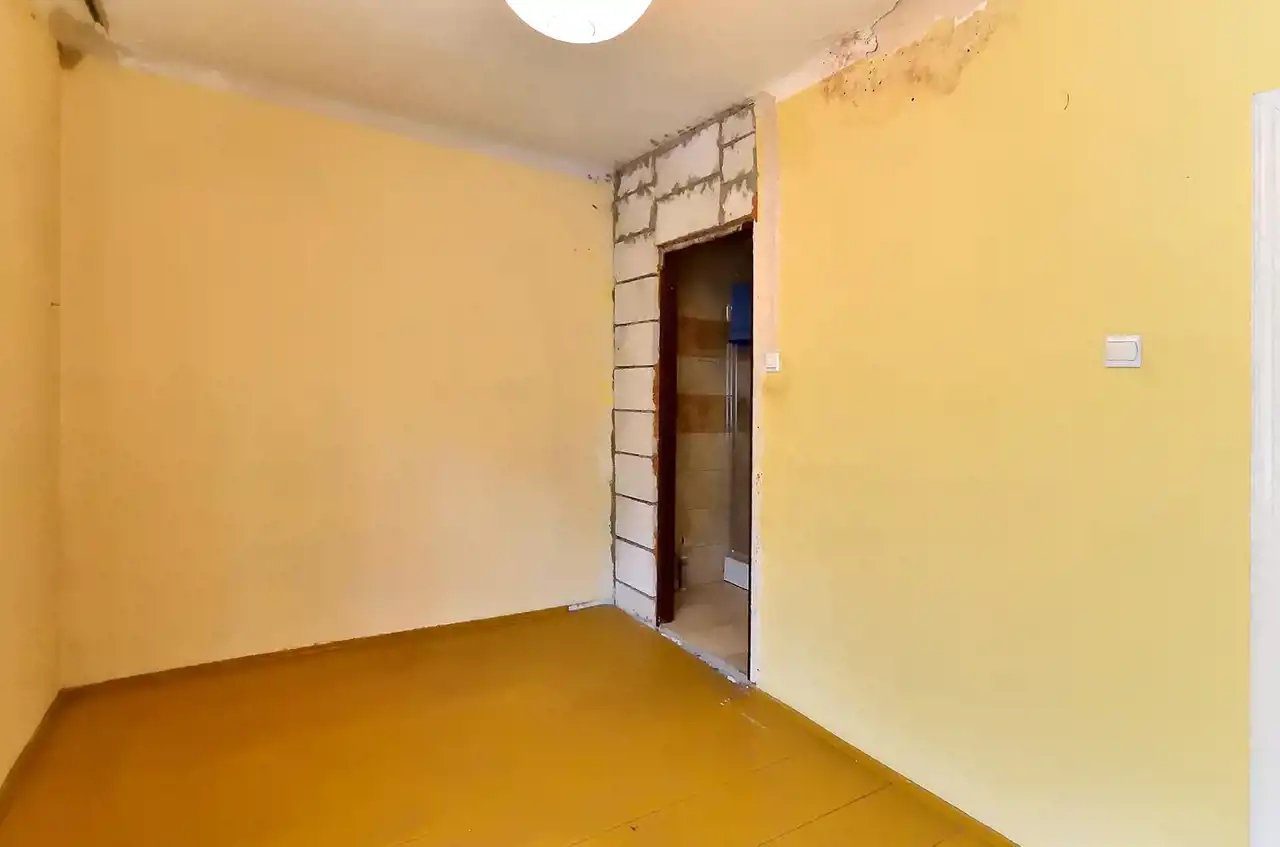 The house requires renovation. Wooden floors, roof covered with roofing felt. The property is connected to the municipal water and sewage system. On the plot, there is also a carport and an outbuilding. The plot is flat, fenced, and located along an asphalt road.