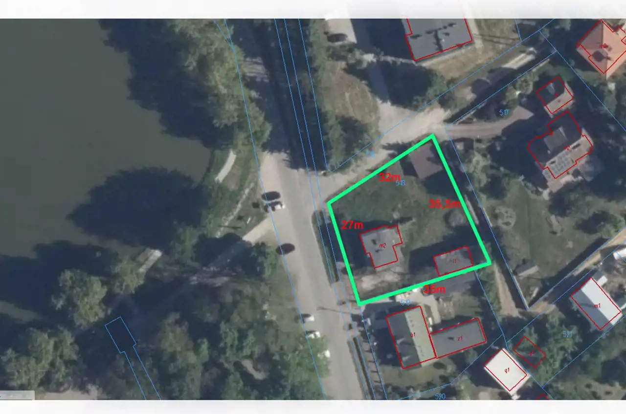Działka (wymiary w przybliżeniu): 27 x 32 x 35,5 x 35 [m]. Front – 27 m
