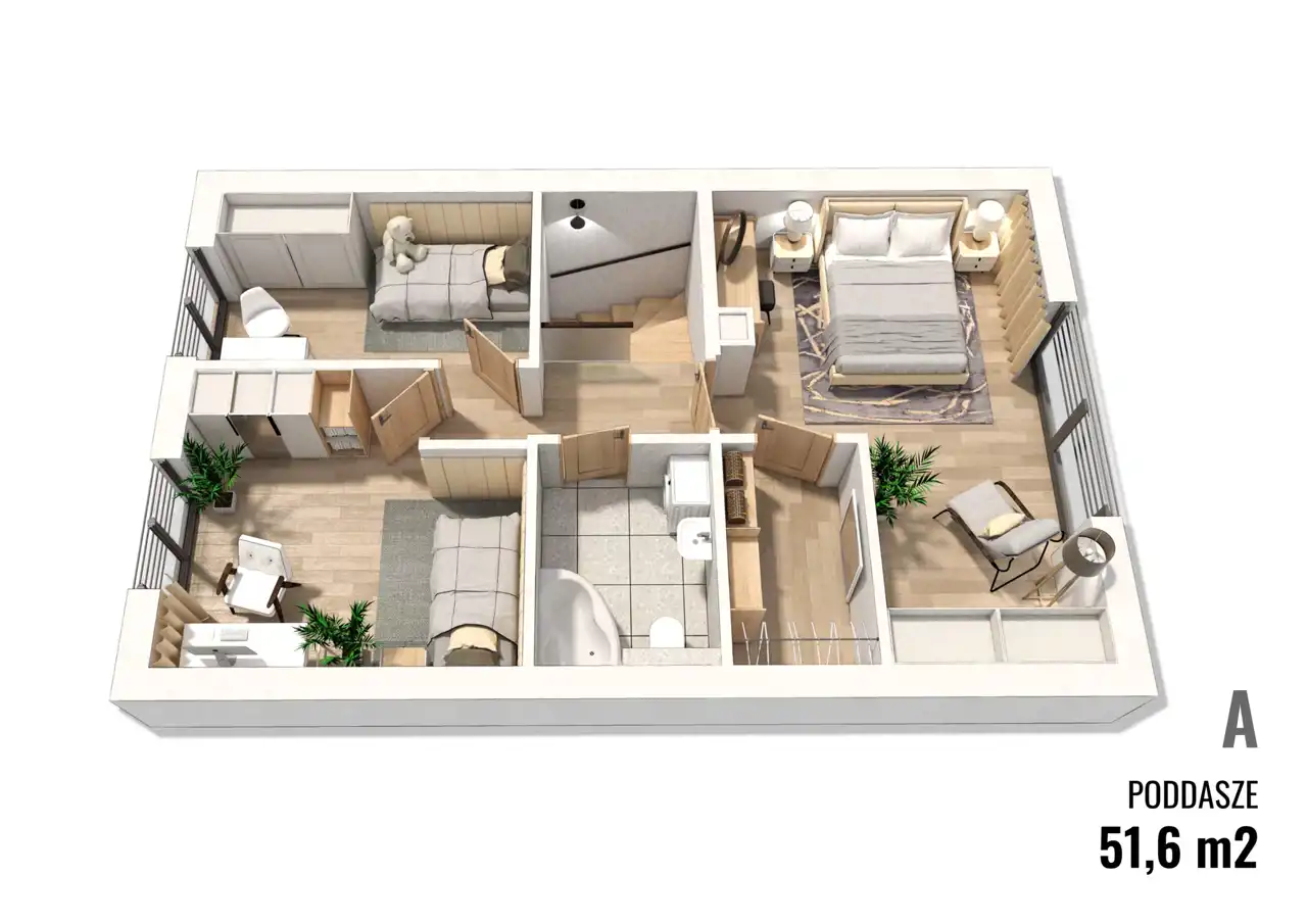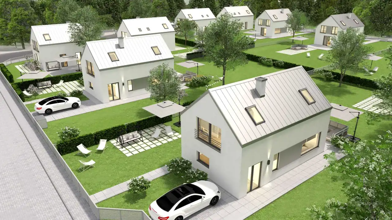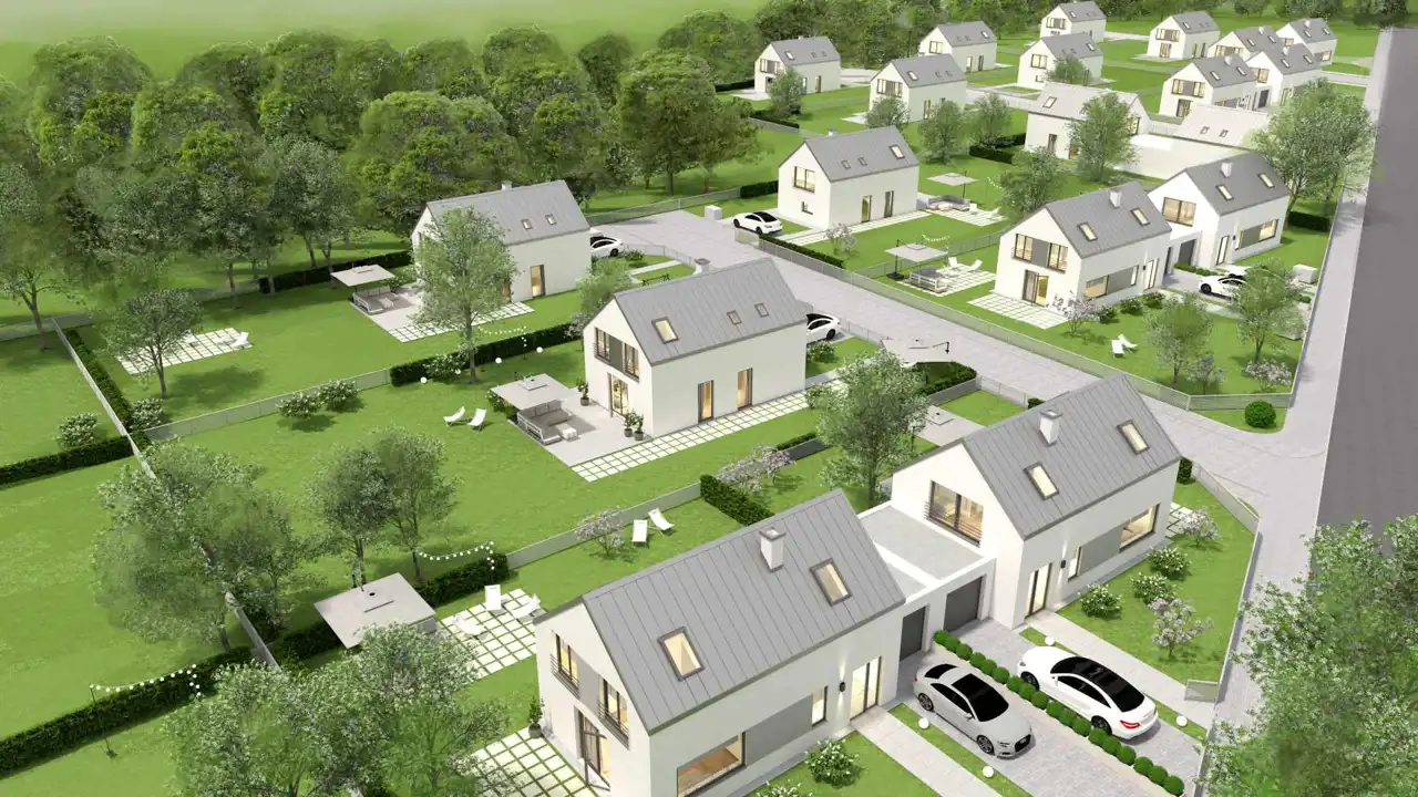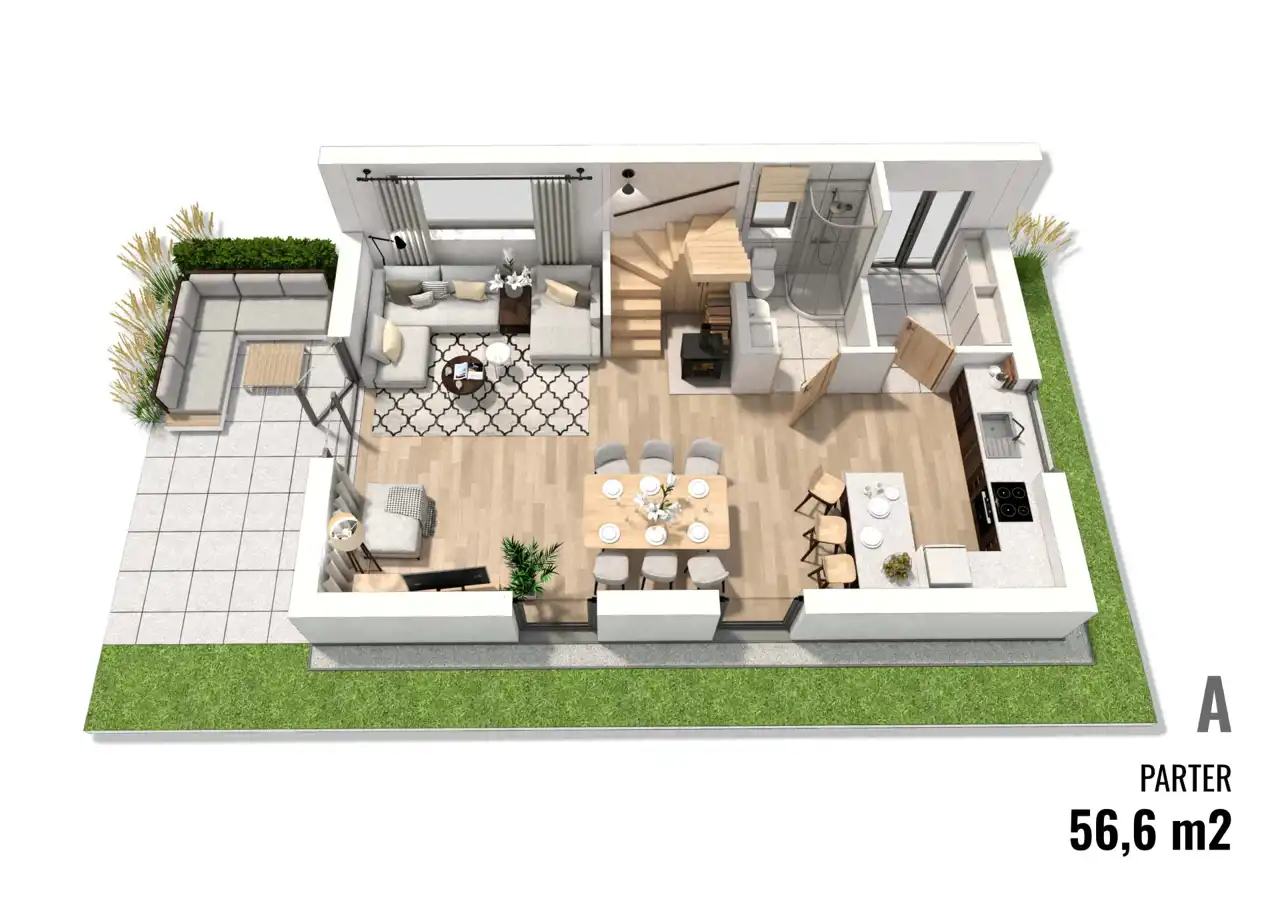 Domy sprzedawane będą w standardzie deweloperskim. Na zdjęciach wnętrz przedstawiono przykładowe wizualizacje wykończenia wewnętrznego (cena nie obejmuje tego wyposażenia lub wykończenia). Wykończenie budynku może się różnić od przedstawionego na wizualizacjach.