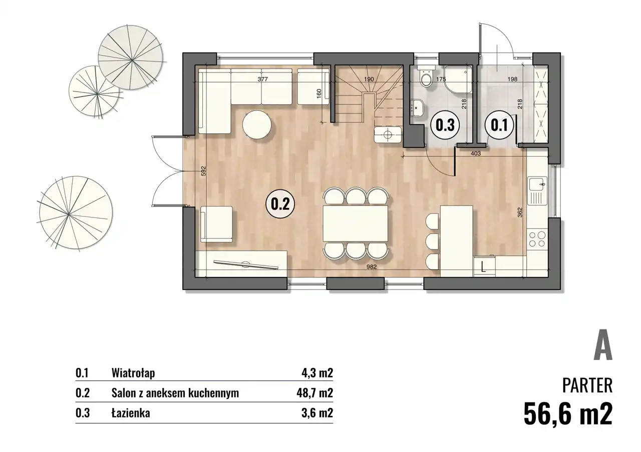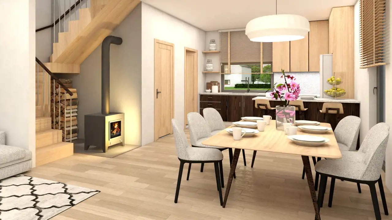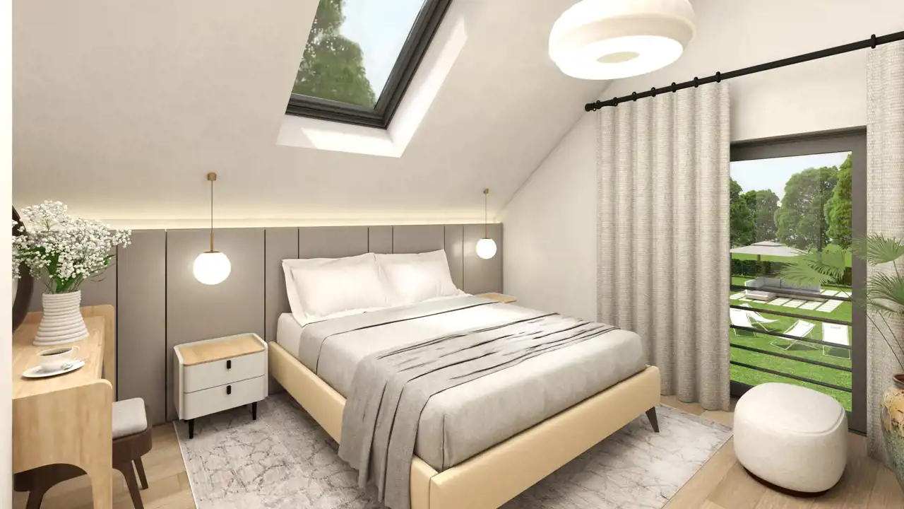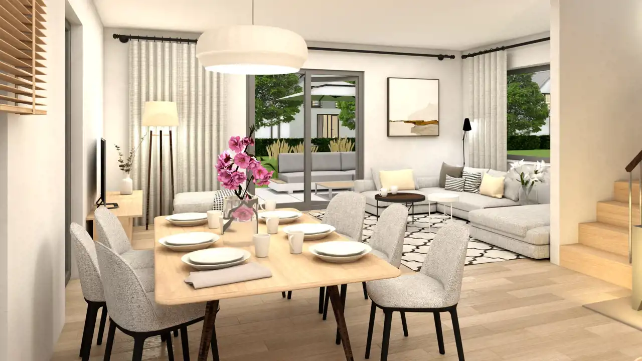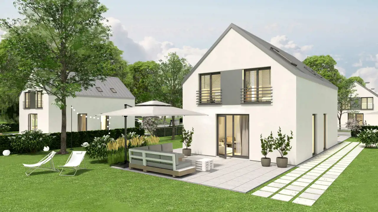 Domy sprzedawane będą w standardzie deweloperskim. Na zdjęciach wnętrz przedstawiono przykładowe wizualizacje wykończenia wewnętrznego (cena nie obejmuje tego wyposażenia lub wykończenia). Wykończenie budynku może się różnić od przedstawionego na wizualizacjach.