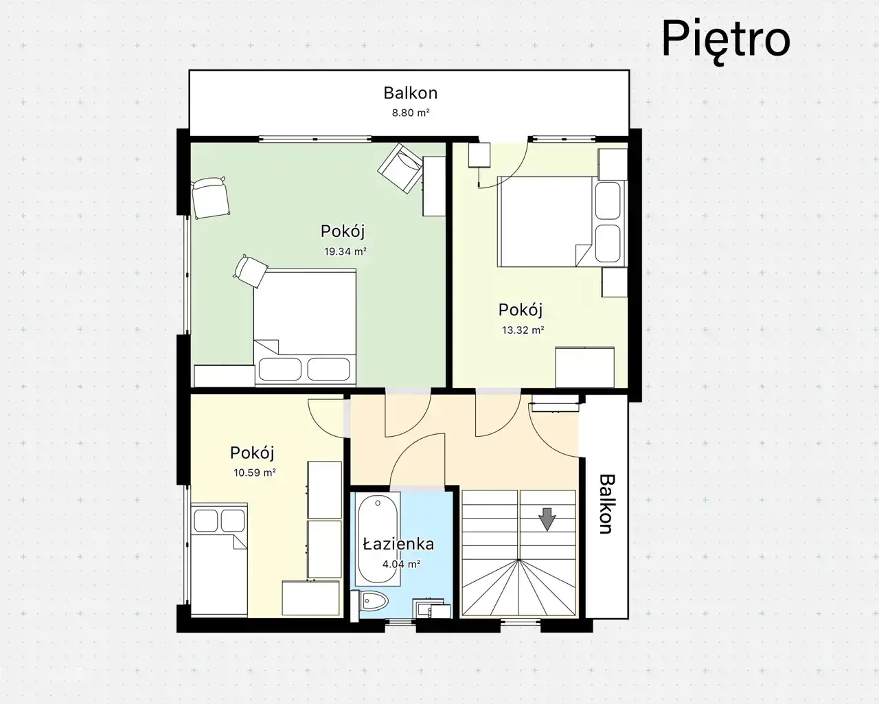 • Piętro: Prywatna strefa domowników z ustawnymi sypialniami, które dzięki dużym oknom są świetnie doświetlone.