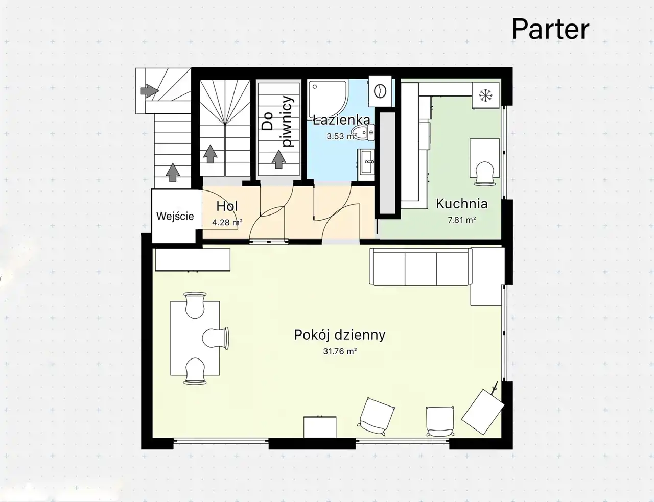 • Parter: Serce domu, w którym znajduje się przestronny salon, jasna kuchnia oraz łazienka. To idealne miejsce na wspólne posiłki i relaks.