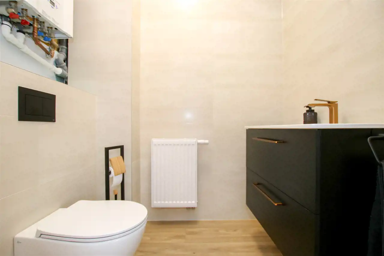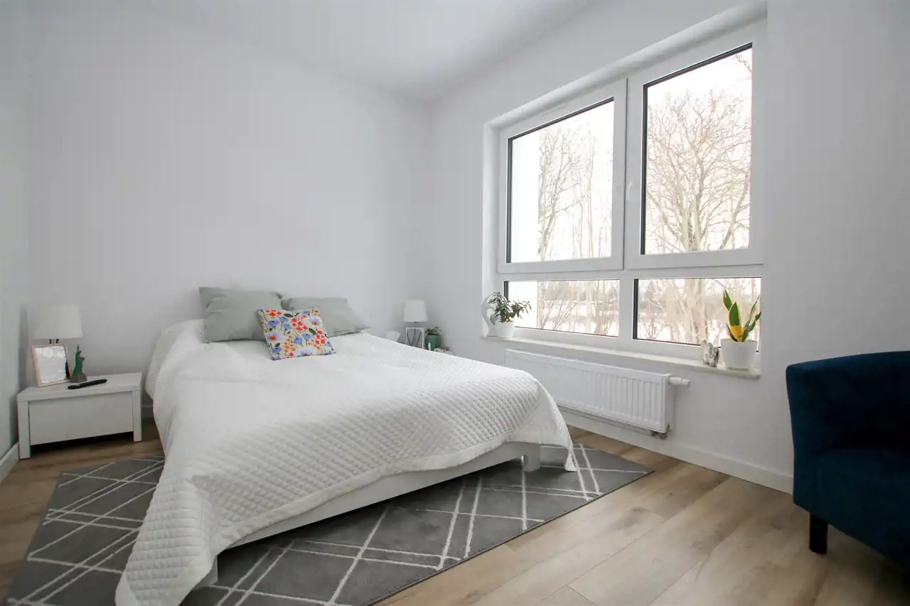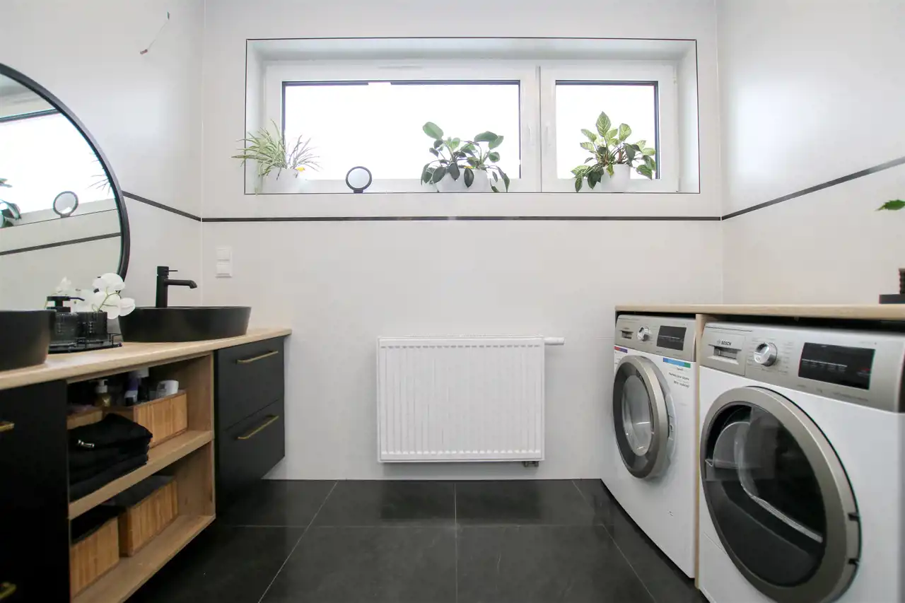 Na piętrze sypialnia jest połączona z garderobą o powierzchni ponad 10m2. W sypialni znajduje się duże podwójne łóżko, szafki nocne a także komoda. Kolejne pomieszczenie stanowi pokój gościnny, który sprawdzi się idealnie jako gabinet. Ostatnim pomieszczeniem na piętrze jest nowoczesna, jasna łazienka w minimalistycznym stylu, wykończona w ponadczasowej kolorystyce bieli, czerni i naturalnego drewna. Duże okno zapewnia doskonałe doświetlenie, a funkcjonalny układ obejmuje przestronny prysznic walk-in oraz wydzieloną strefę pralni z pralką i suszarką. Wysoki standard wykończenia, gotowa do użytkowania.