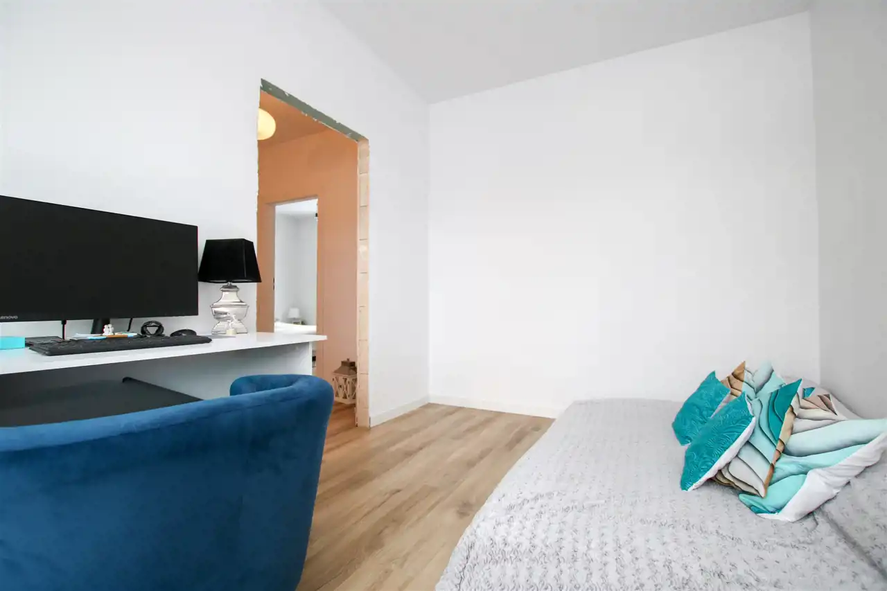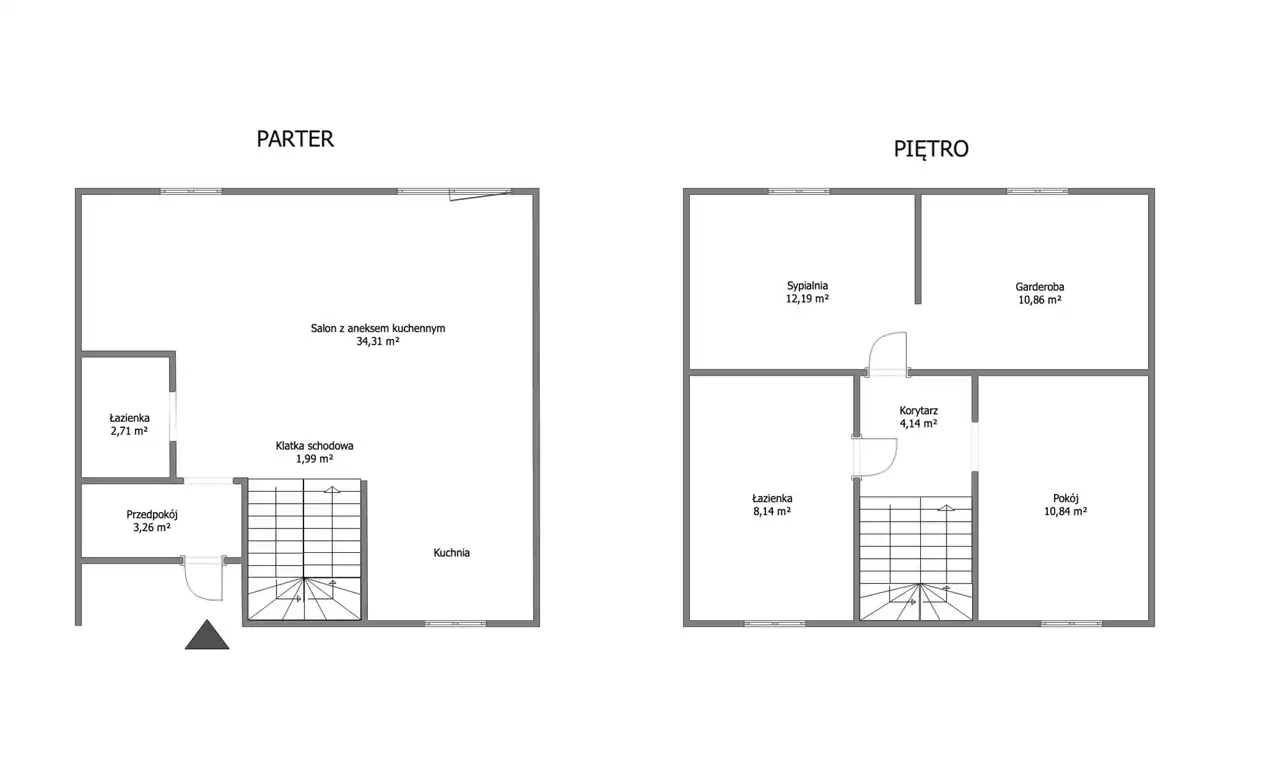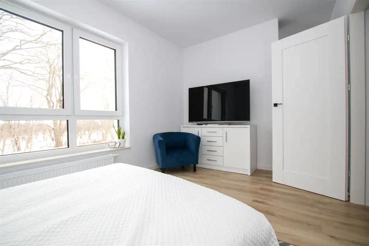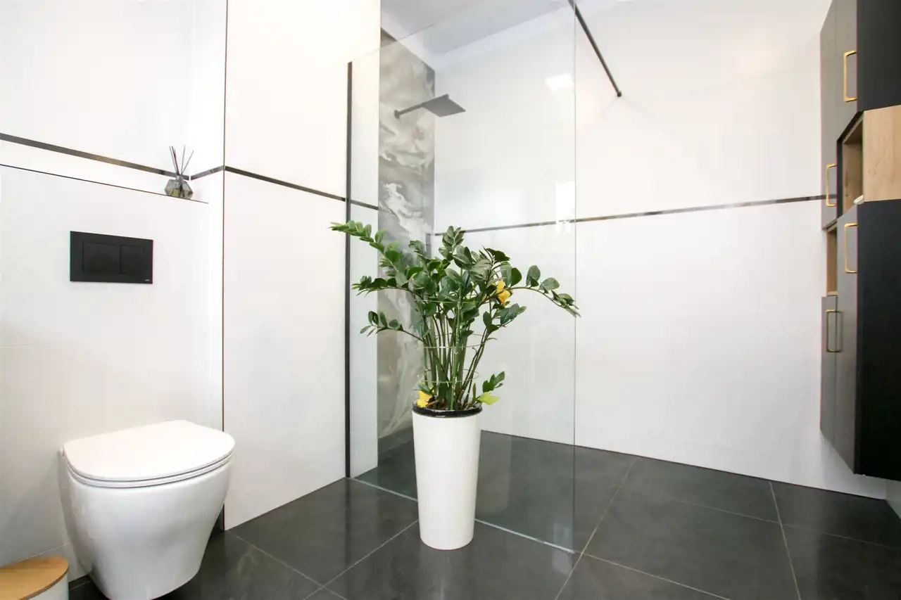 Na piętrze sypialnia jest połączona z garderobą o powierzchni ponad 10m2. W sypialni znajduje się duże podwójne łóżko, szafki nocne a także komoda. Kolejne pomieszczenie stanowi pokój gościnny, który sprawdzi się idealnie jako gabinet. Ostatnim pomieszczeniem na piętrze jest nowoczesna, jasna łazienka w minimalistycznym stylu, wykończona w ponadczasowej kolorystyce bieli, czerni i naturalnego drewna. Duże okno zapewnia doskonałe doświetlenie, a funkcjonalny układ obejmuje przestronny prysznic walk-in oraz wydzieloną strefę pralni z pralką i suszarką. Wysoki standard wykończenia, gotowa do użytkowania.