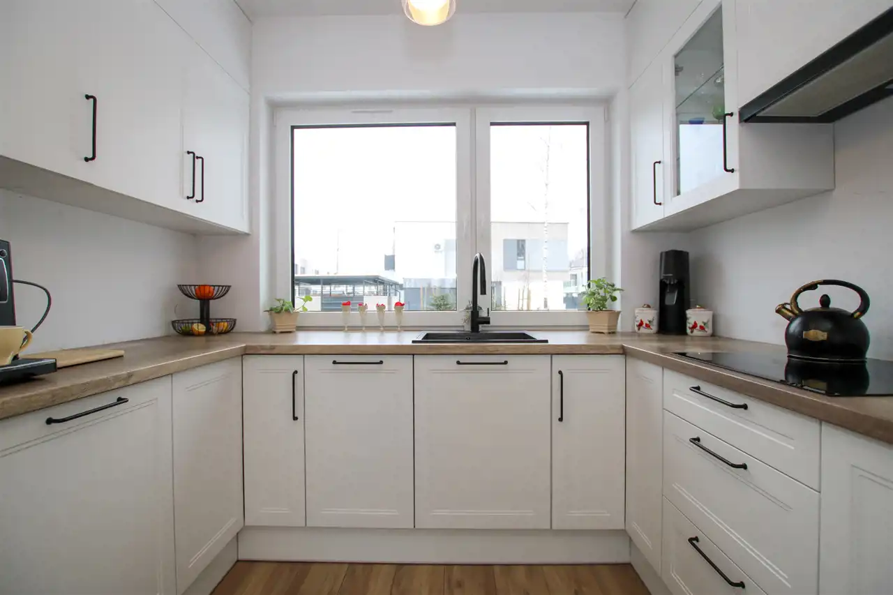 Dom, na który składa się ustawny salon wyłożony gresem, wyposażony w wygodną sofę, stół z krzesłami, telewizor. Duże okna balkonowe sprawiają, że w pomieszczeniu jest słonecznie przez cały dzień. Z salonu jest wyjście do pięknego ogrodu z tarasem. Kuchnia zabudowana meblami na wymiar, a także wyposażona w sprzęt AGD i RTV tj. lodówkę, płytę indukcyjną, piekarnik, mikrofalówkę, okap kuchenny oraz zlew z baterią. Na parterze znajduje się również toaleta oraz przedpokój. Pod schodami jest dodatkowa przestrzeń na przechowywanie niezbędnych rzeczy.