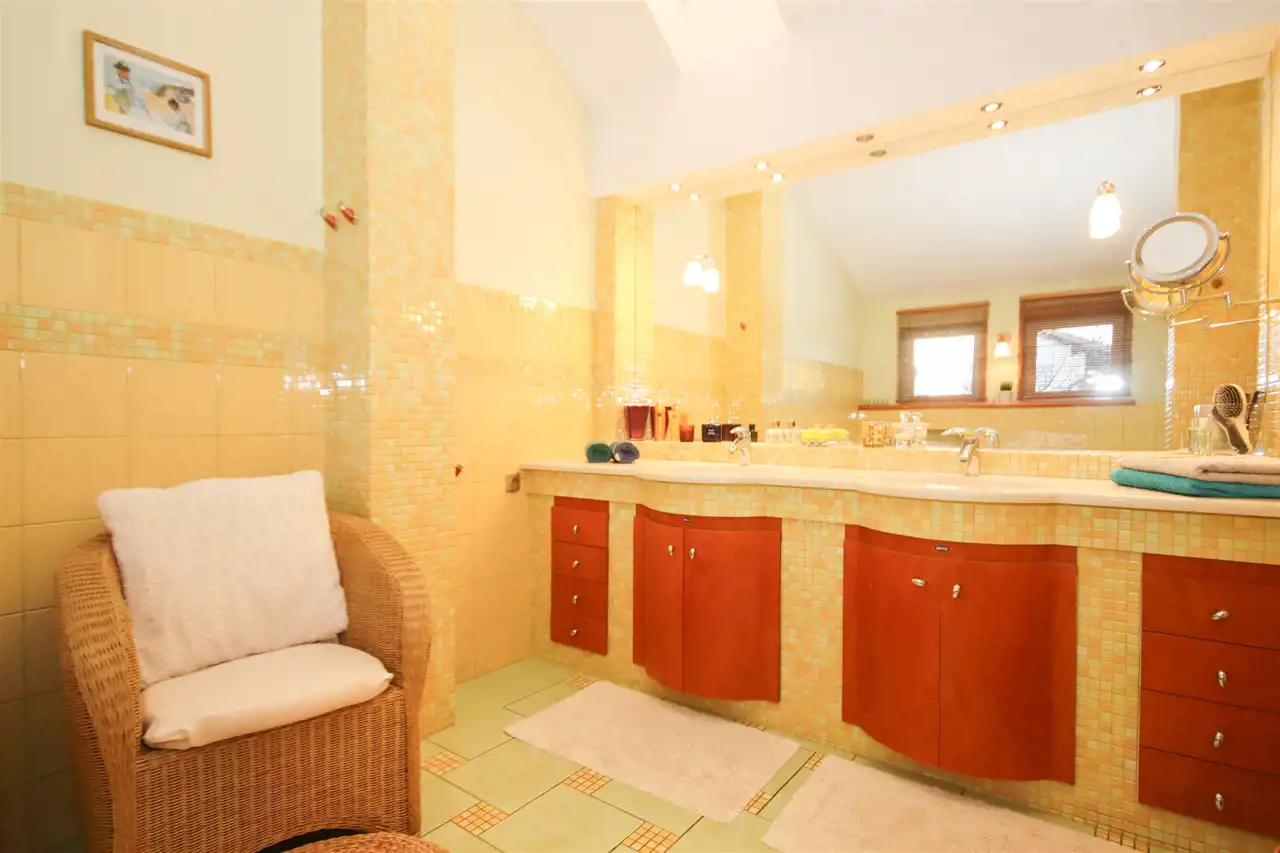 - duża, elegancka łazienka z oknami, wanną, dwiema umywalkami i dużym lustrem 11,20 m²