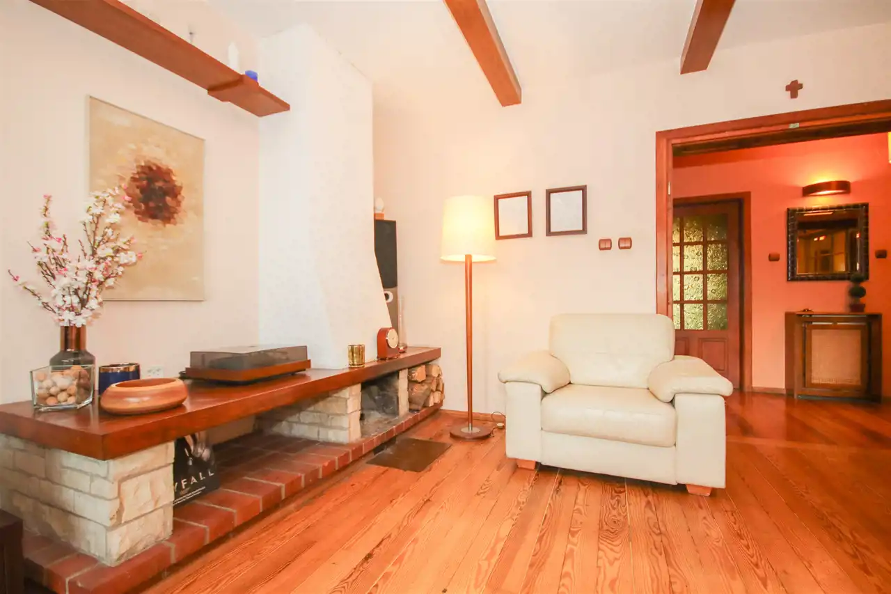 - przestronny salon z klimatycznym, otwartym kominkiem