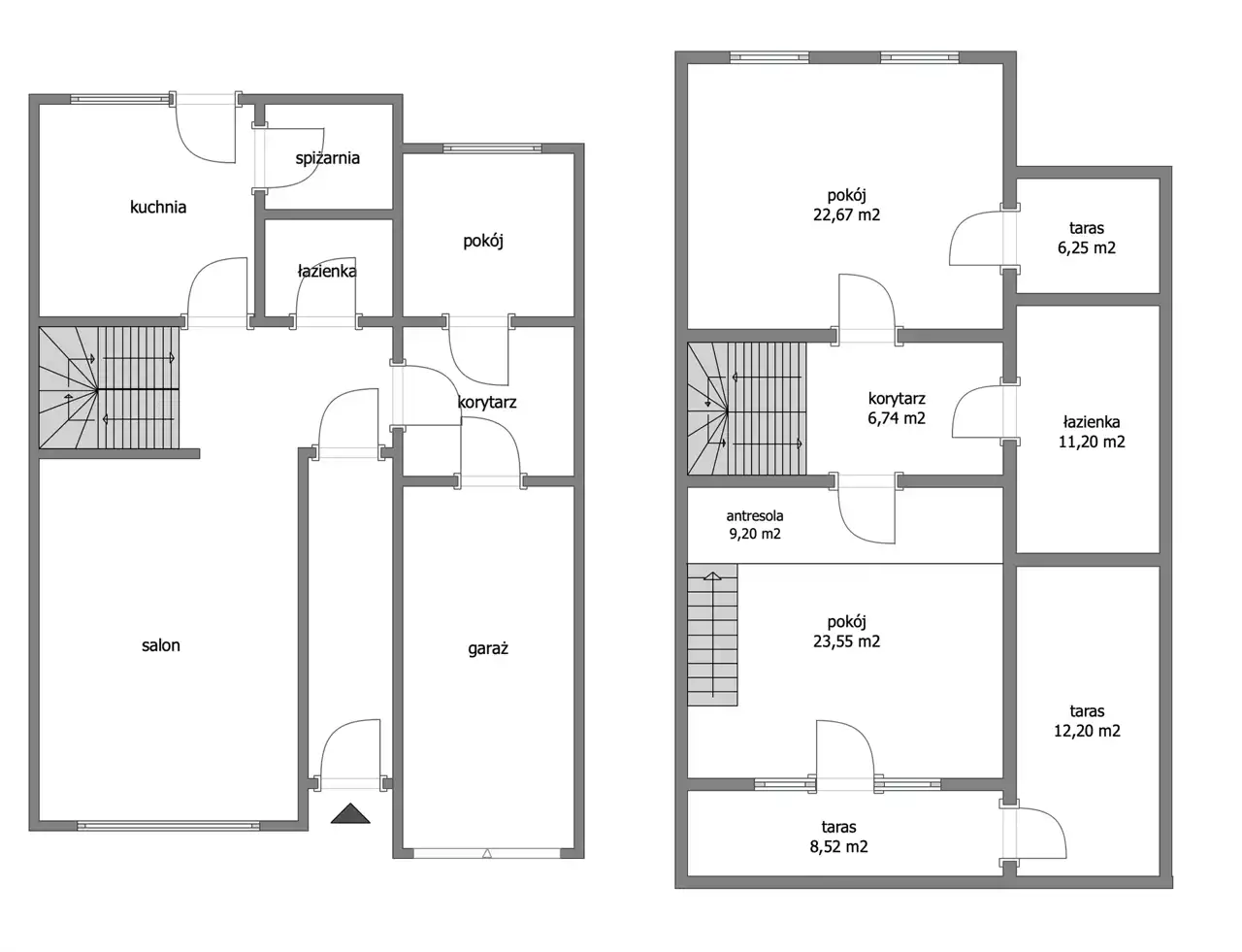 - drugi, duży pokój 23,55 m² z możliwością podziału na dwa niezależne pokoje (wyjście na dwa tarasy 8,52 m², oraz 12,20 m²)