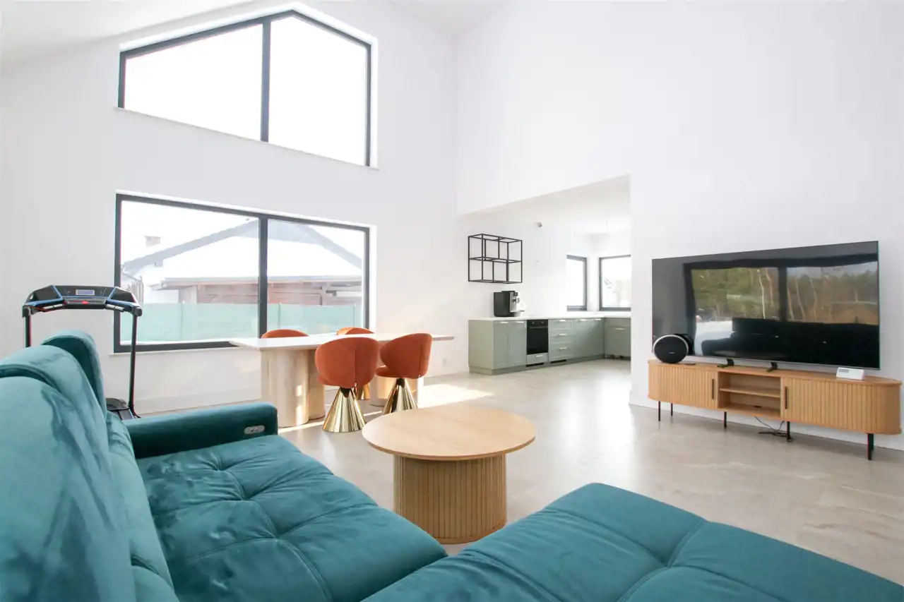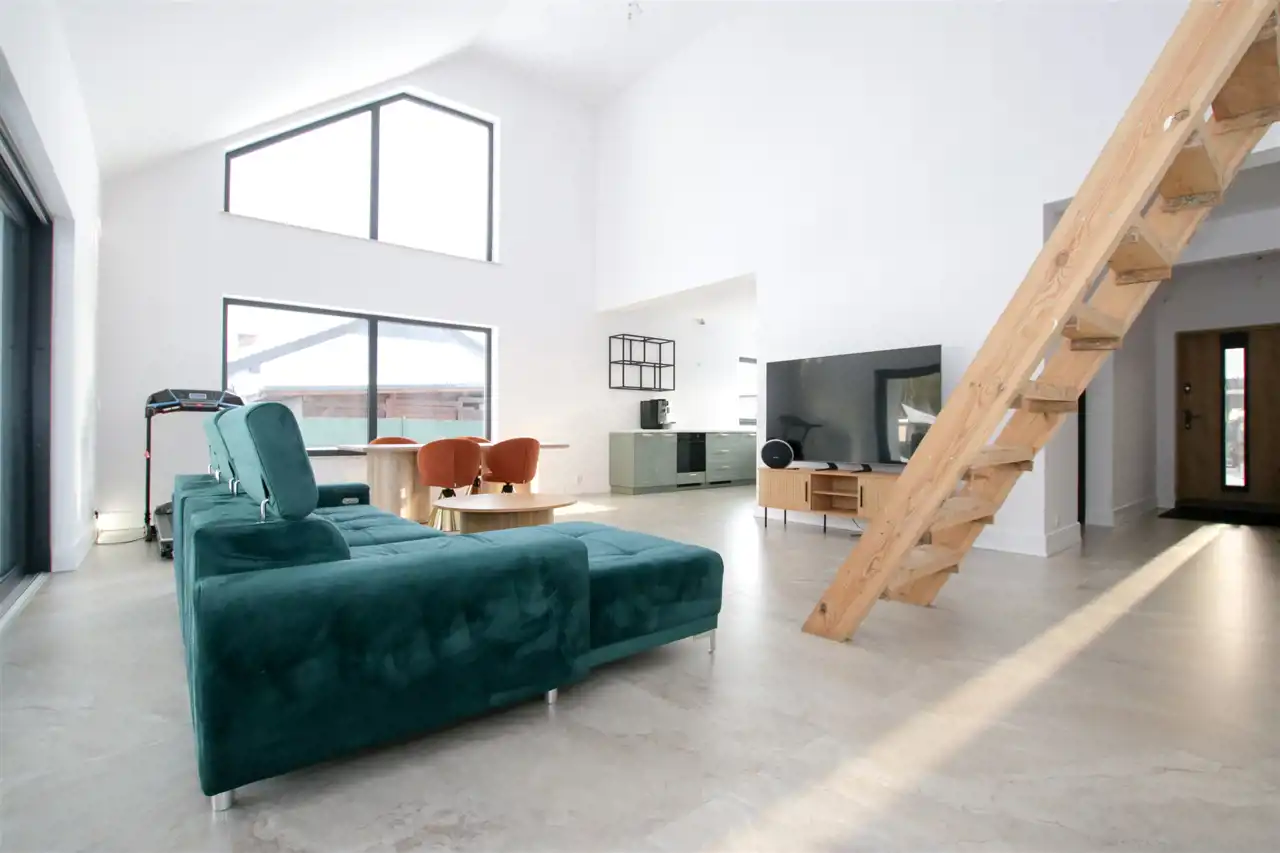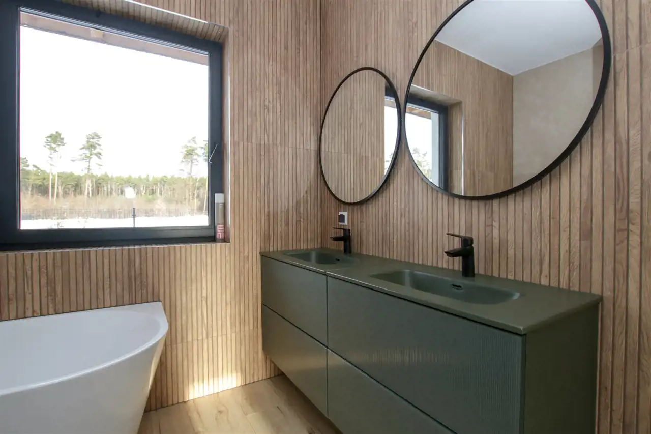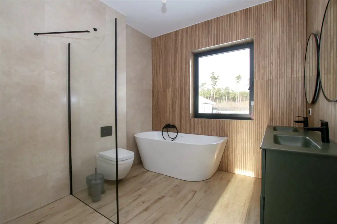 Wnętrza utrzymane są w nowoczesnym, minimalistycznym stylu. Jasne kolory, naturalne materiały oraz duże okna nadają przestrzeni lekkości i elegancji. Łazienka zachwyca połączeniem ciepłych okładzin drewnopodobnych z nowoczesną ceramiką i czarną armaturą.