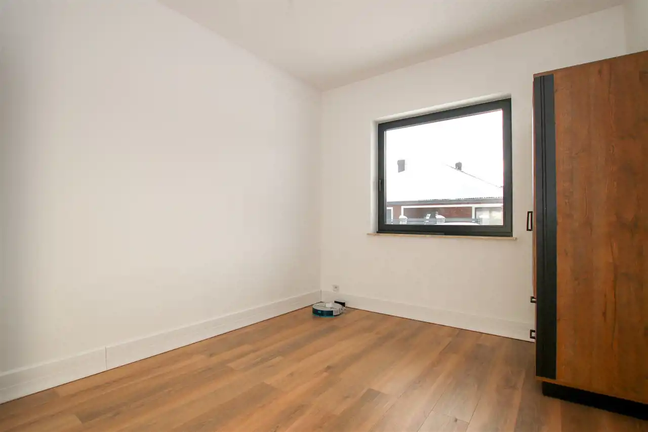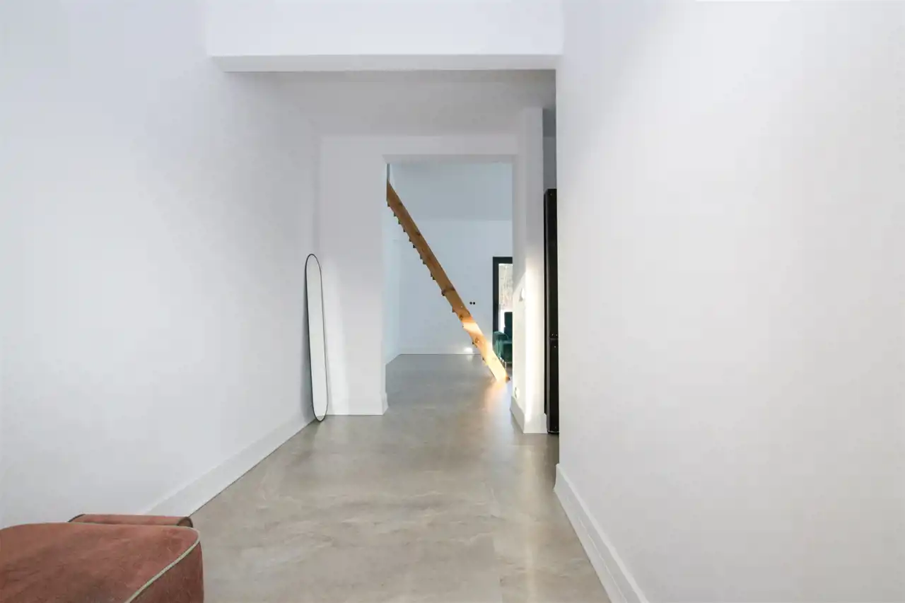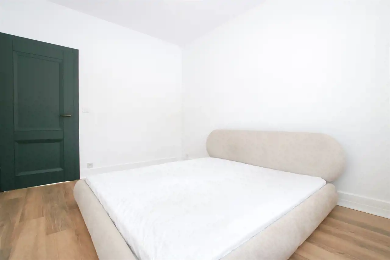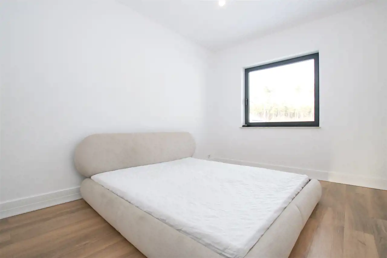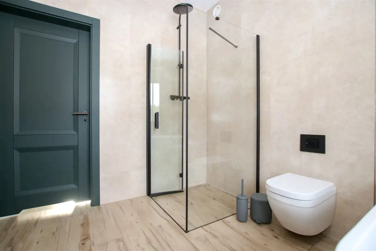 Wnętrza utrzymane są w nowoczesnym, minimalistycznym stylu. Jasne kolory, naturalne materiały oraz duże okna nadają przestrzeni lekkości i elegancji. Łazienka zachwyca połączeniem ciepłych okładzin drewnopodobnych z nowoczesną ceramiką i czarną armaturą.