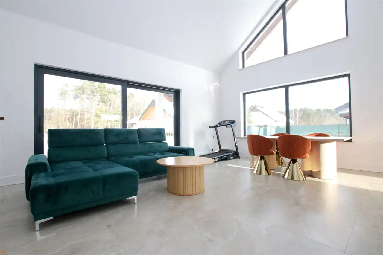 Dom został zaprojektowany z myślą o wygodzie codziennego użytkowania. Wyjątkowy pokój dzienny, w którym znajdują się przeszklenia o dużej powierzchni - wpuszczają do wnętrza zdecydowanie więcej światła, niż tradycyjne okna. Prezentują się spektakularnie, spajają człowieka z otoczeniem i są poniekąd spełnieniem marzenia o nowoczesnej architekturze na własnej działce.