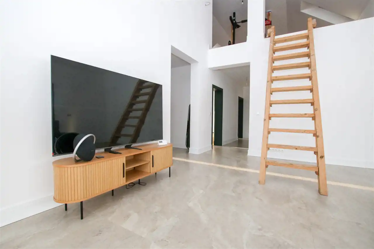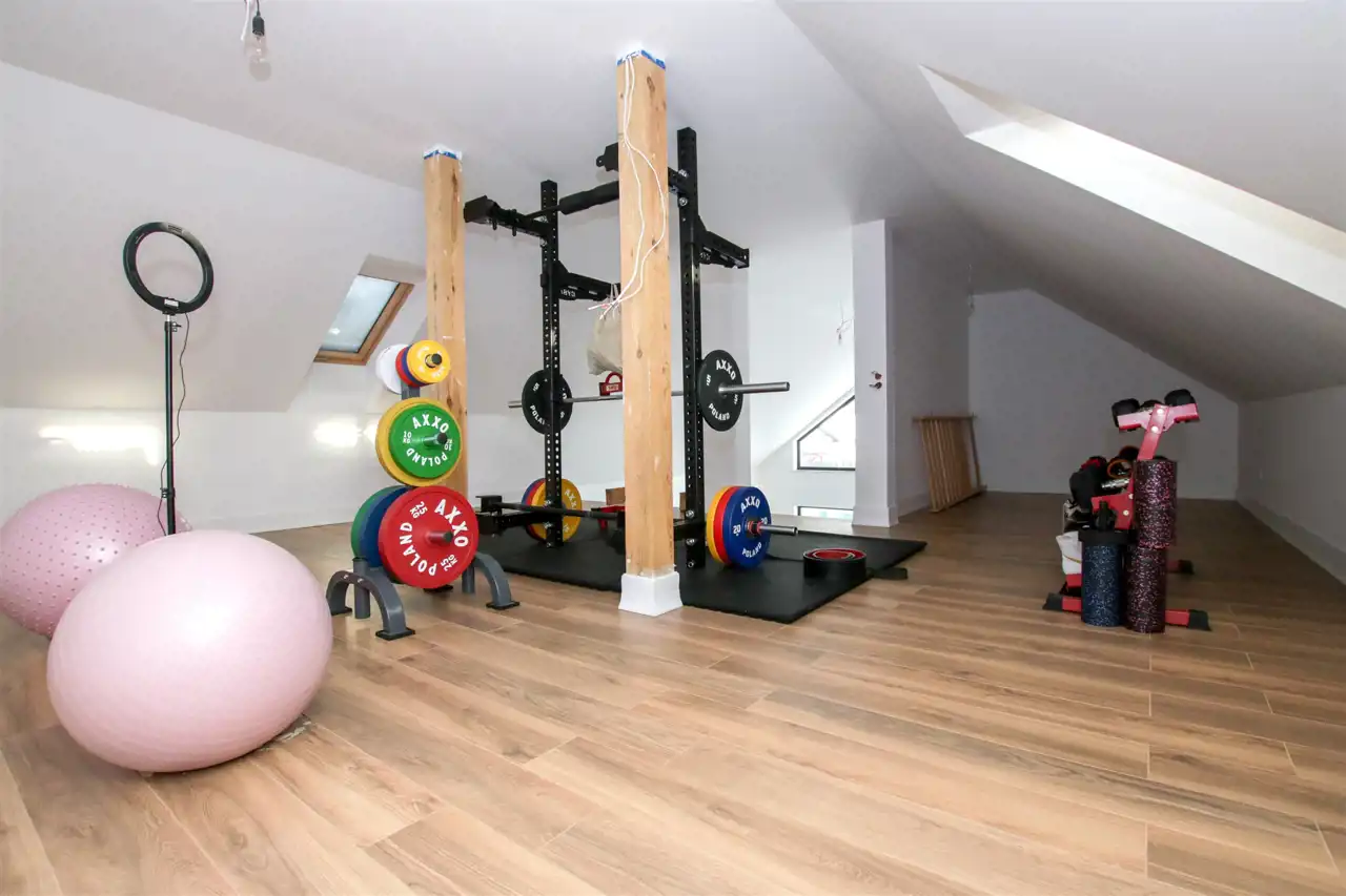 Na piętrze znajduje się antresola o powierzchni 57,90 m2, która doskonale sprawdzi się jako strefa relaksu, siłownia, miejsce do pracy lub dodatkowa przestrzeń rekreacyjna.