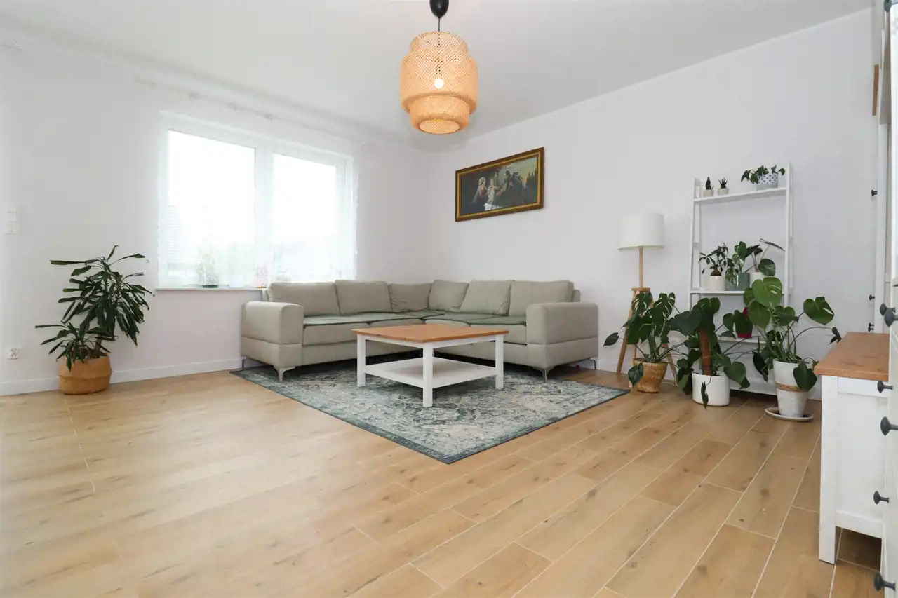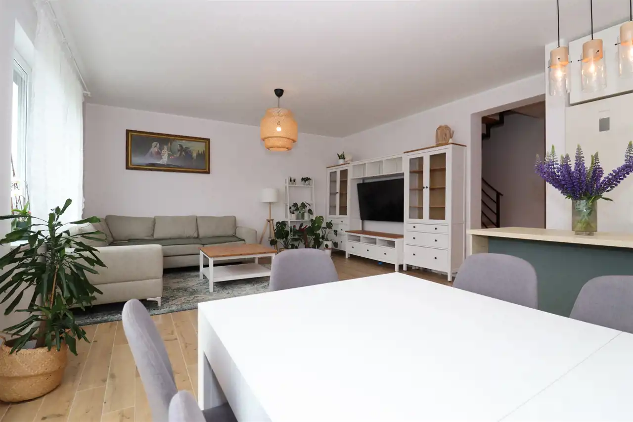 - Jasny salon z dużymi przeszkleniami i wyjściem na ogród.