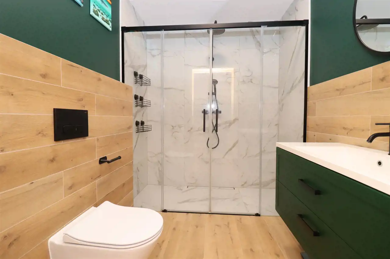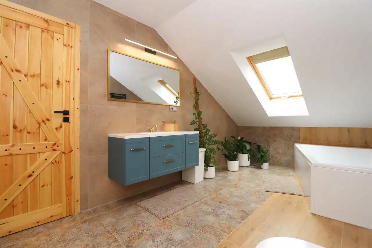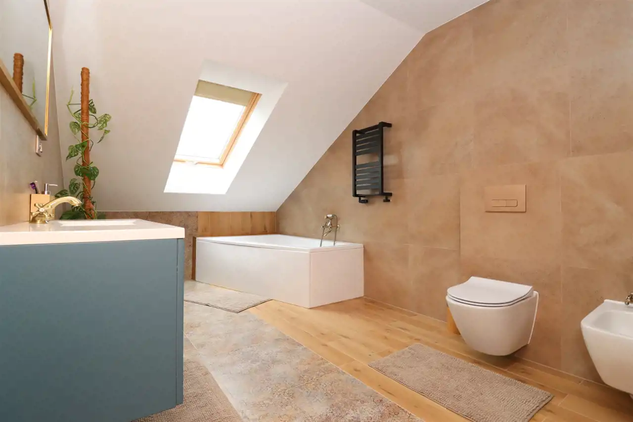 - Przestronna łazienka z narożną wanną, umywalką w zabudowie, toaletą i bidetem.