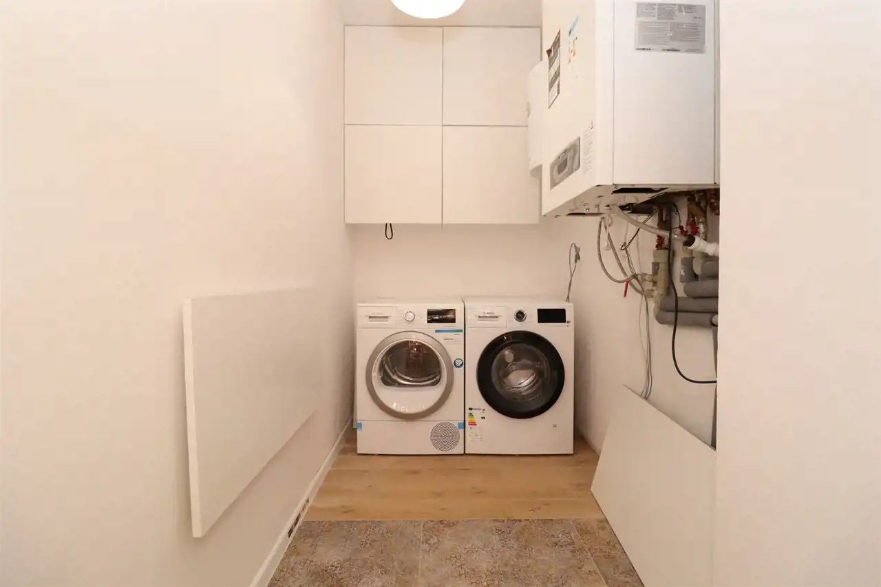 - Kuchnia płynnie połączona z salonem, wyposażona w AGD (lodówka, zmywarka, płyta indukcyjna, piekarnik, pochłaniacz).