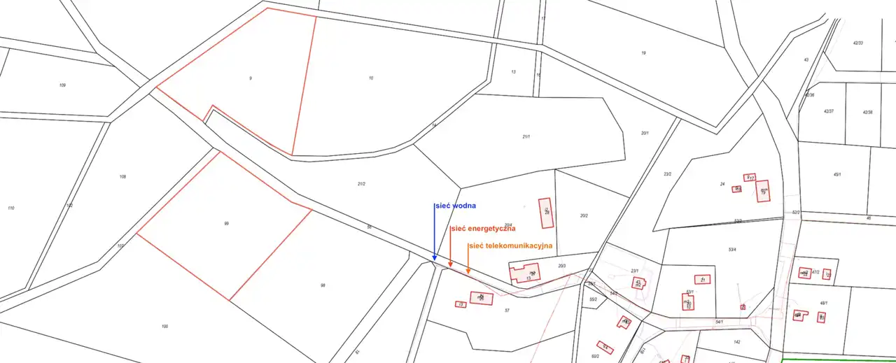 - Media Woda: w drodze; Kanalizacja: brak; Prąd: w ulicy