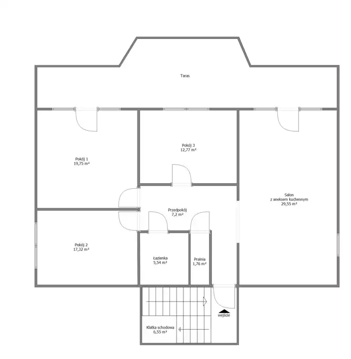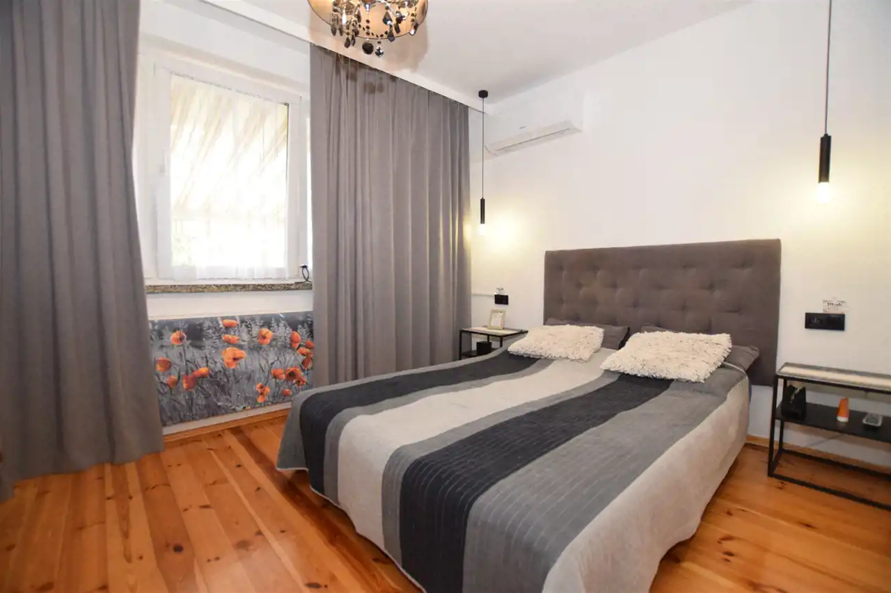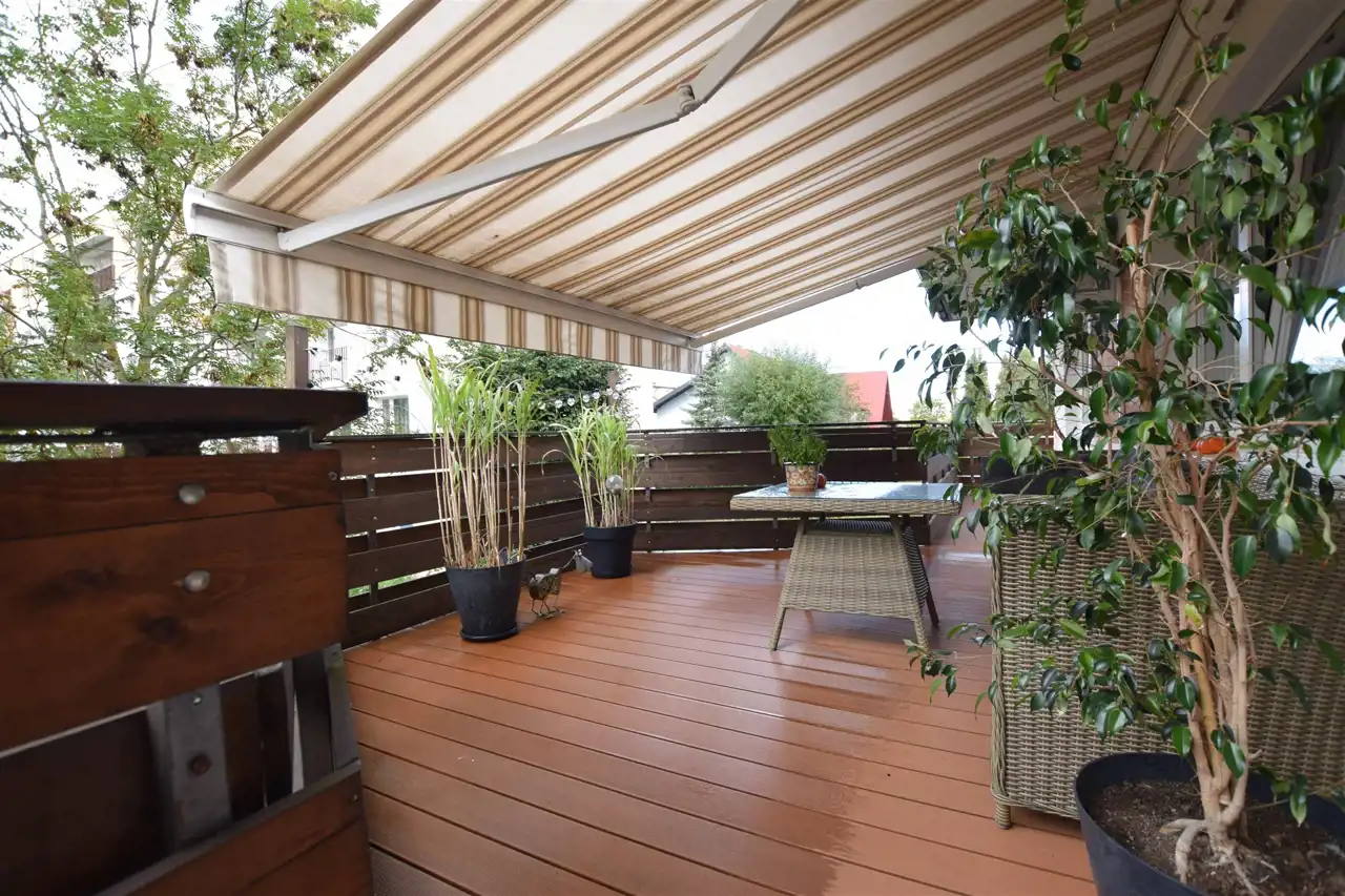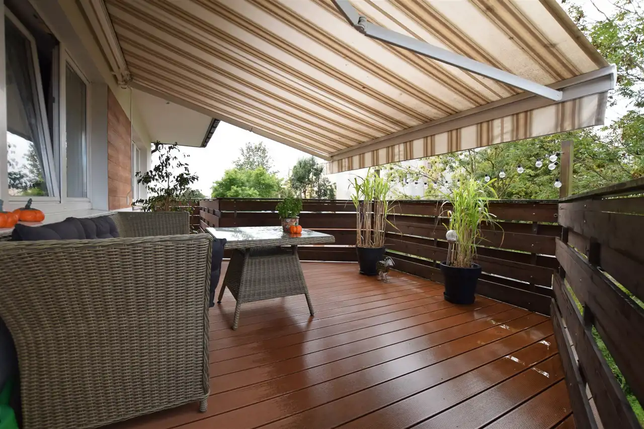 - Dodatkowo: duży taras wyłożony deską kompozytową, wyposażony w rozkładaną markizę