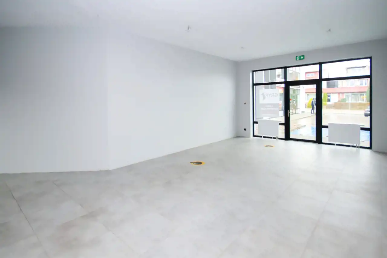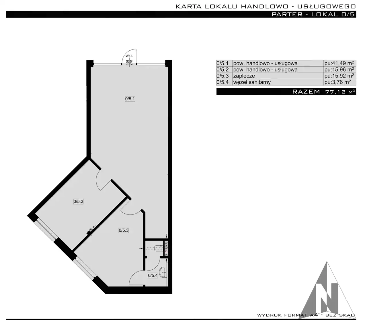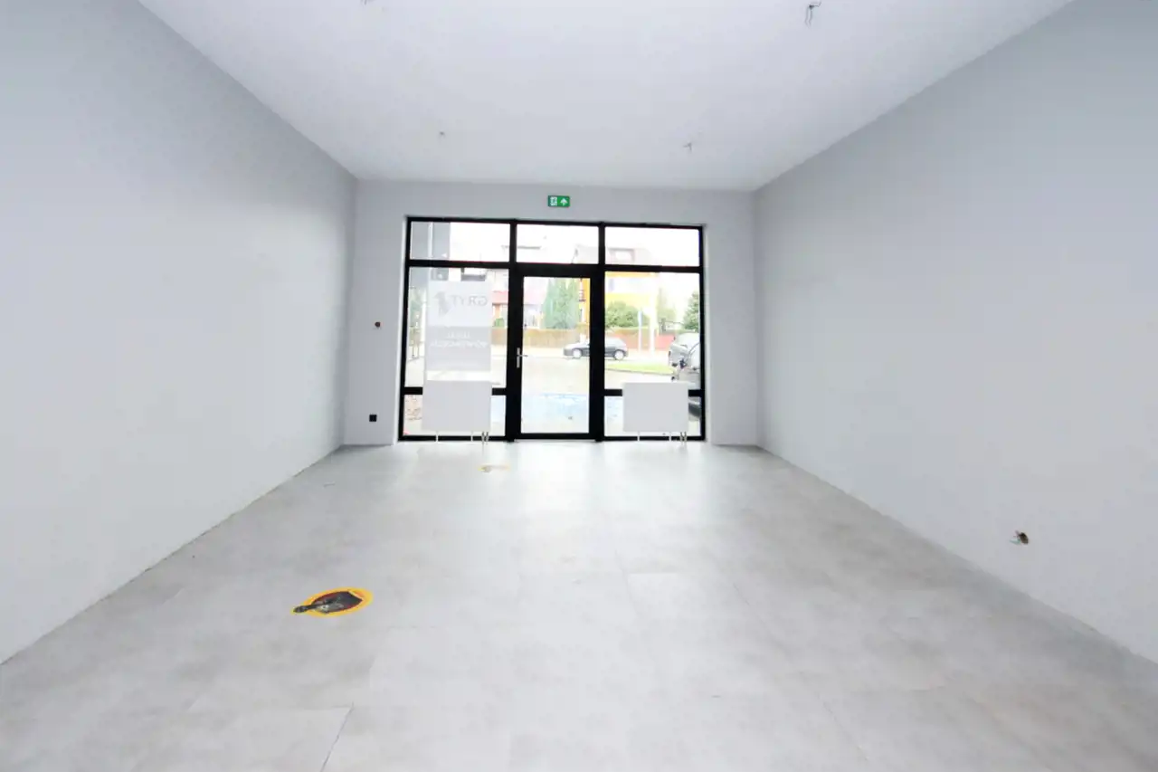 Lokal to łączna powierzchnia 77,13 m2, na którą składają się dwa pomieszczenia handlowo – usługowe (41,49 m2 i 15,96 m2), zaplecze (15,92 m2), węzeł sanitarny z WC (3,76 m2).