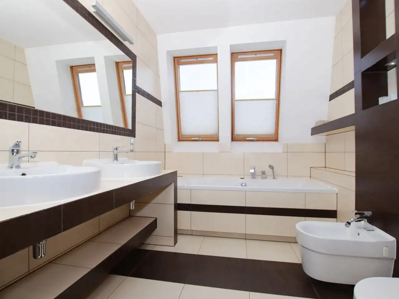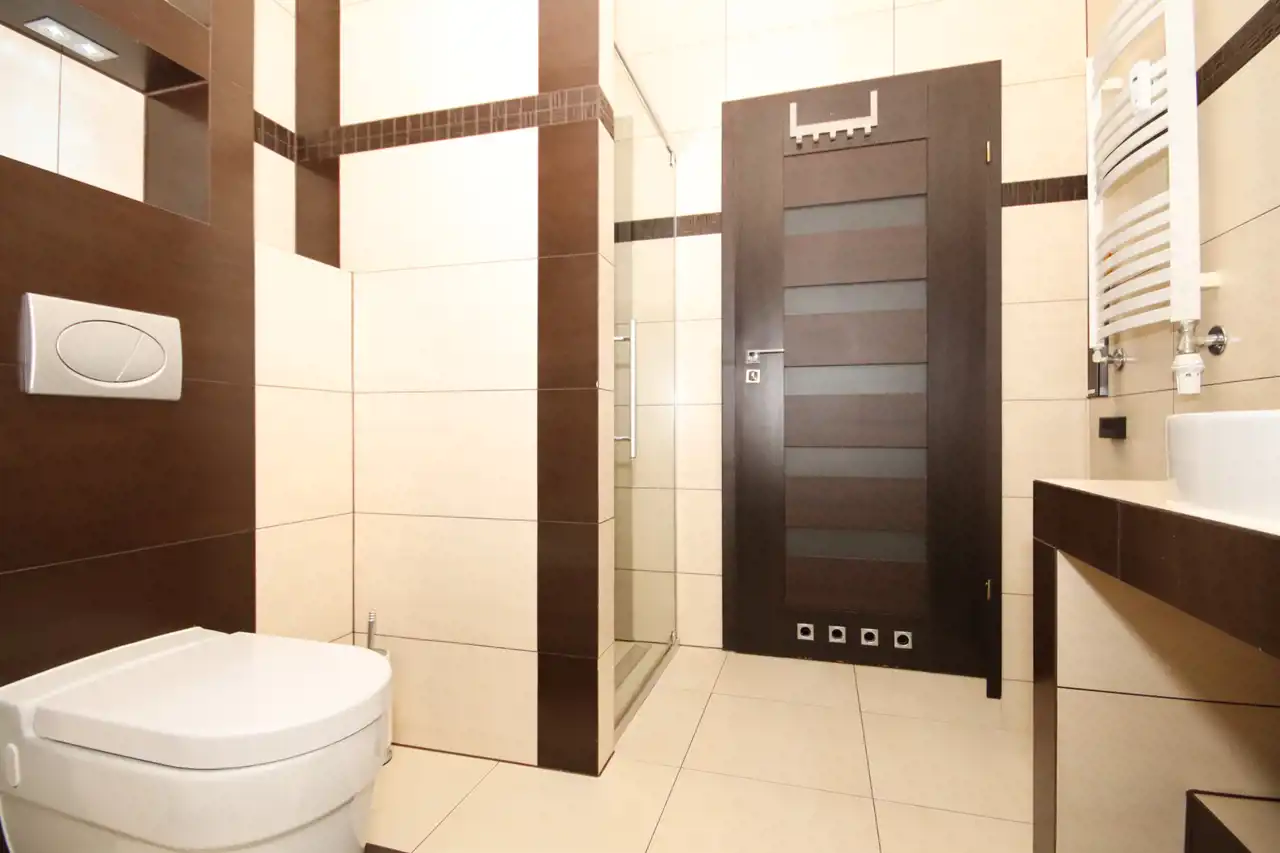 - Elegancka łazienka (10,26 m²) z WC – duży pokój kąpielowy wyposażony w wannę, prysznic, bidet i dwustanowiskową umywalkę, który zapewni wygodę i luksus w codziennym użytkowaniu,