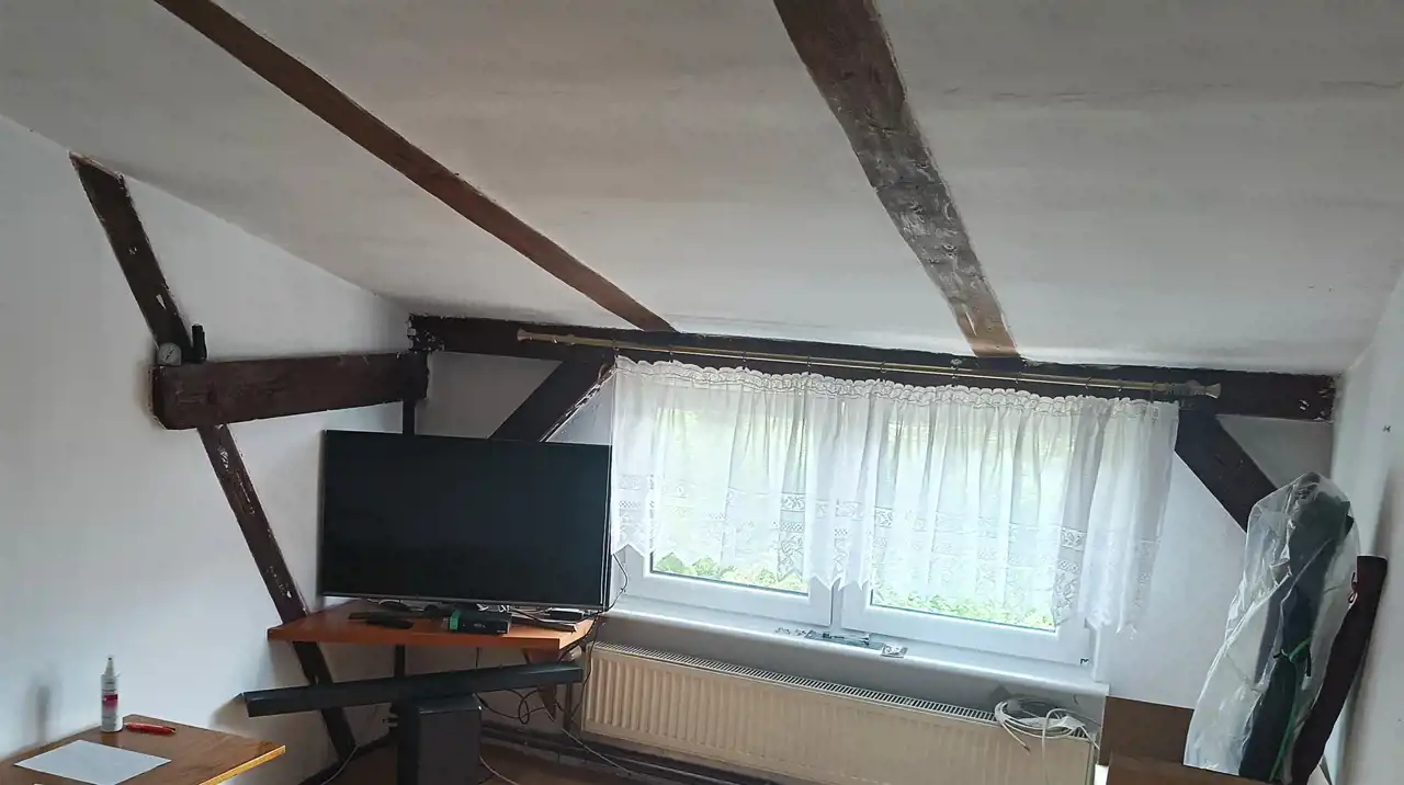 Mieszkanie zaaranżowane na poddaszu o powierzchni 28,83 m2 ( po podłodze 36,55 m2), składa się z dwóch pokoi, w tym jeden z aneksem kuchennym, łazienki z wc doświetlonej oknem, przestronnego przedpokoju oraz pomieszczenia gospodarczego w którym zainstalowany jest dwuobiegowy piec gazowy marki Buderus..