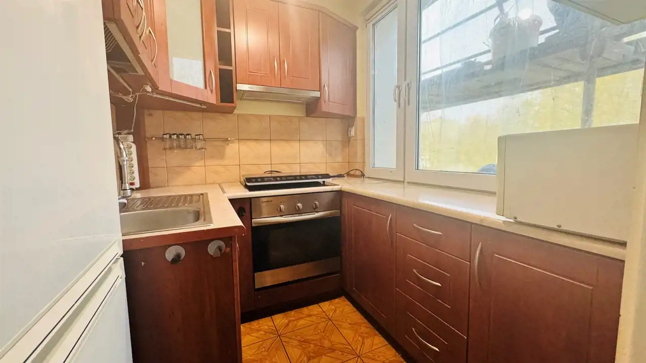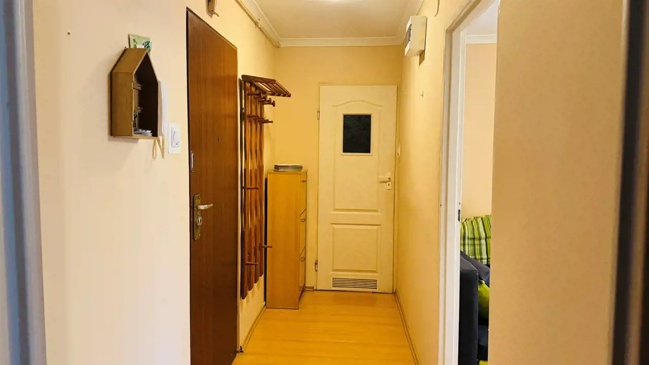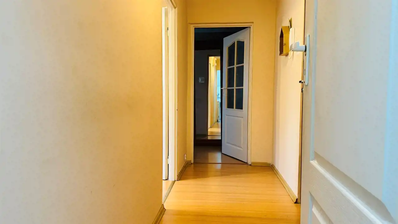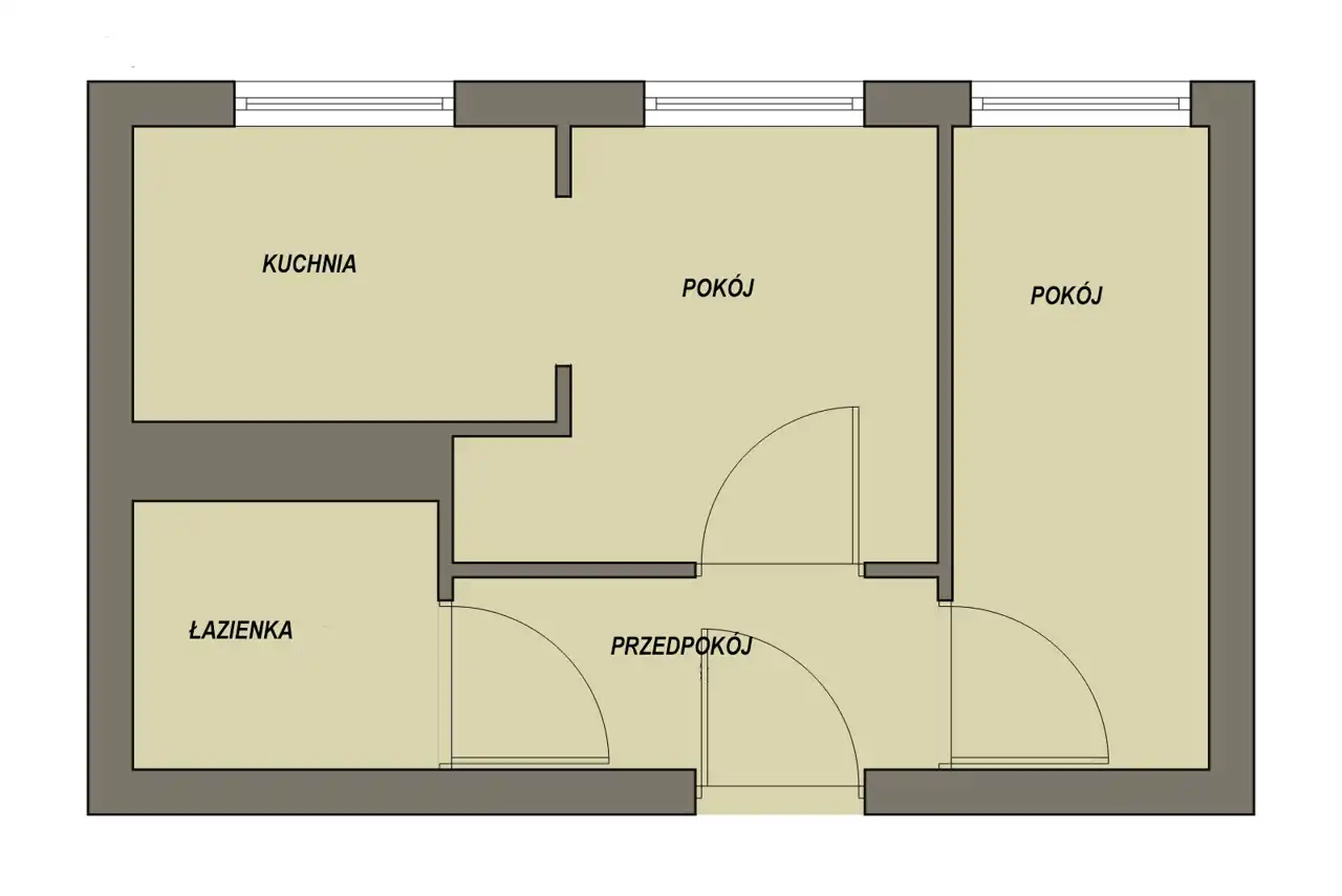 Mieszkanie składa się z korytarza, dwóch pokoi, łazienki z w.c. i kuchni z oknem. Z korytarza wejścia do dwóch pokoi i łazienki. Z większego pokoju wejście do kuchni. Do mieszkania przynależy pomieszczenie w piwnicy.