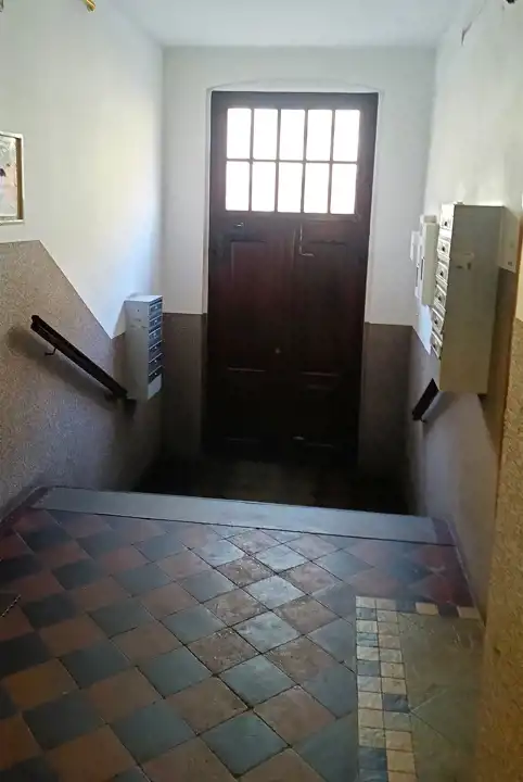 Klatka schodowa czysta, zadbana zamykana domofonem.