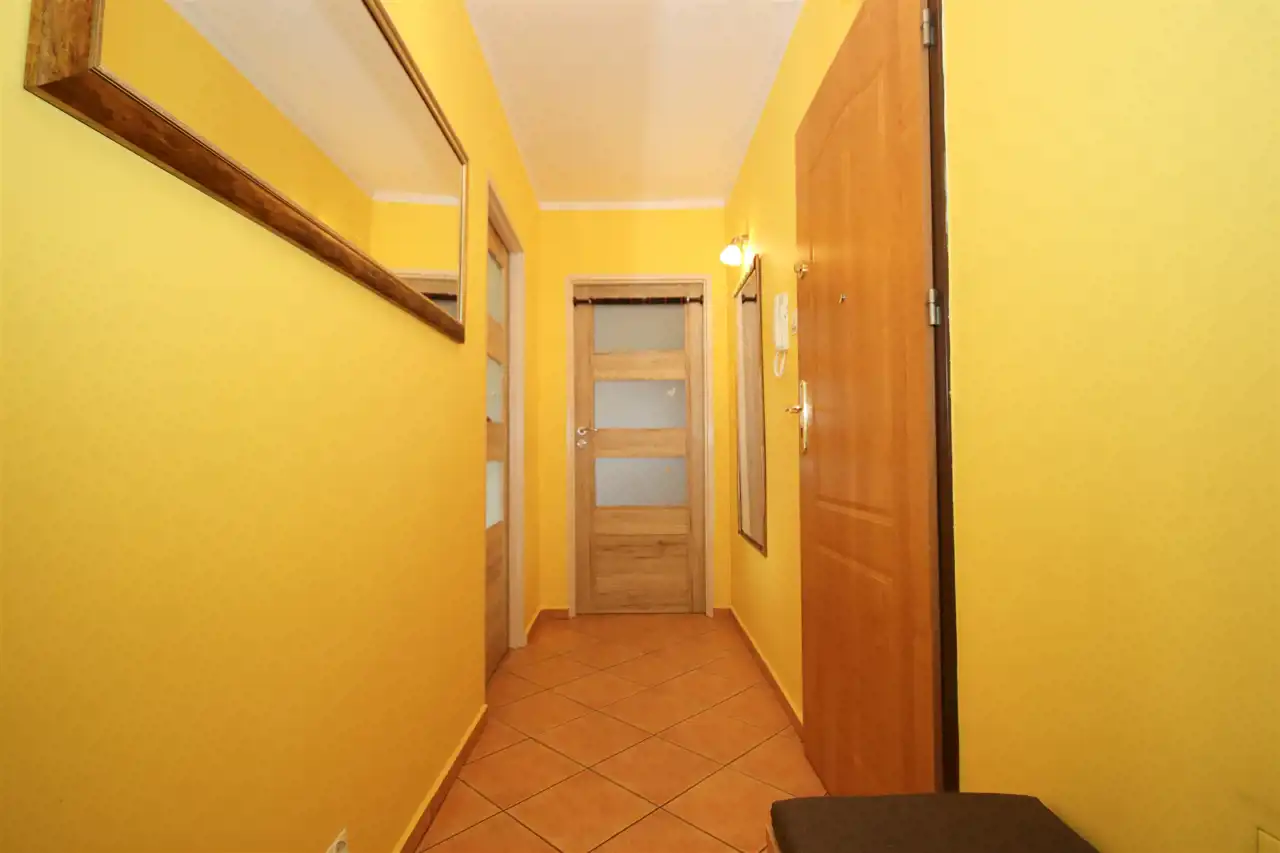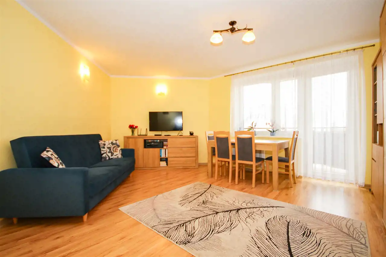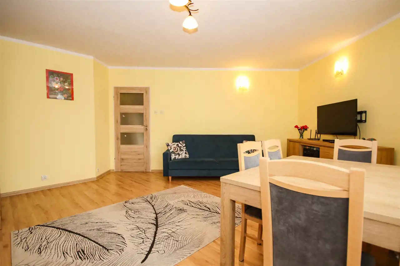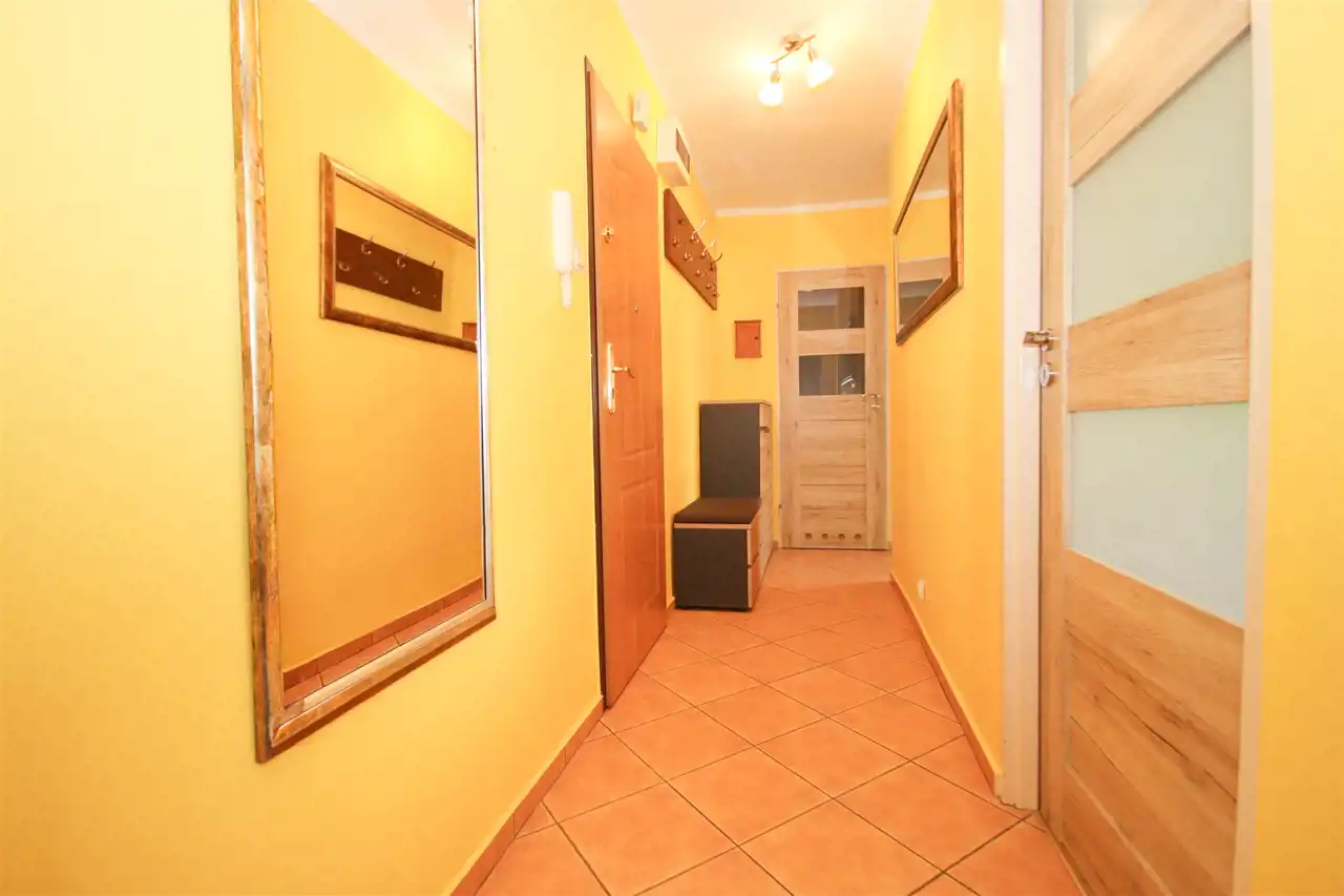 Mieszkanie składa się z dwóch niezależnych, ustawnych pokoi, osobnej kuchni, łazienki oraz przedpokoju. Taki układ zapewnia wygodę oraz prywatność domownikom, a także daje duże możliwości aranżacyjne. Do mieszkania przynależy również piwnica, co zwiększa przestrzeń do przechowywania. Dodatkowym atutem mieszkania jest balkon, który stanowi idealne miejsce do odpoczynku.