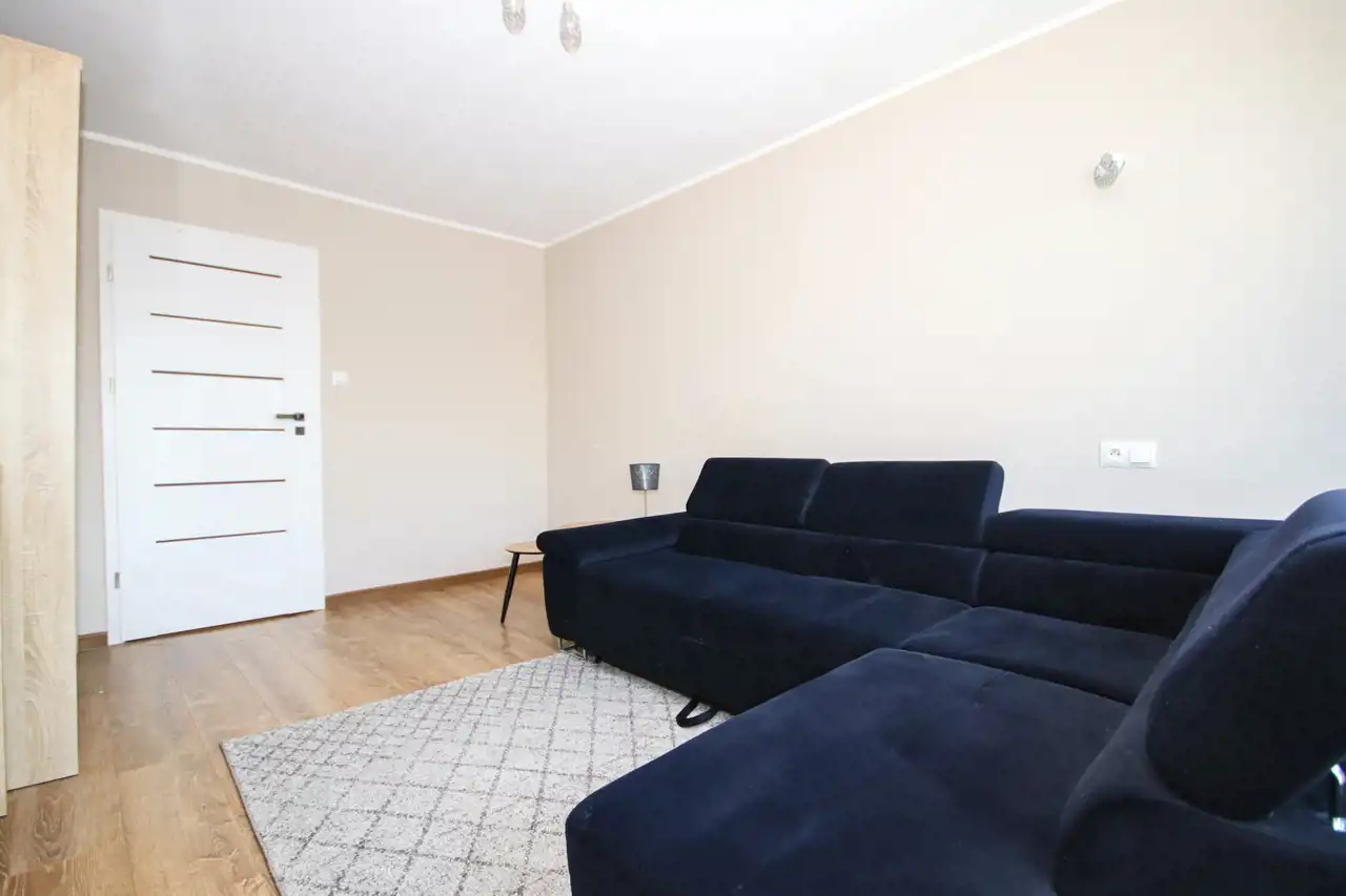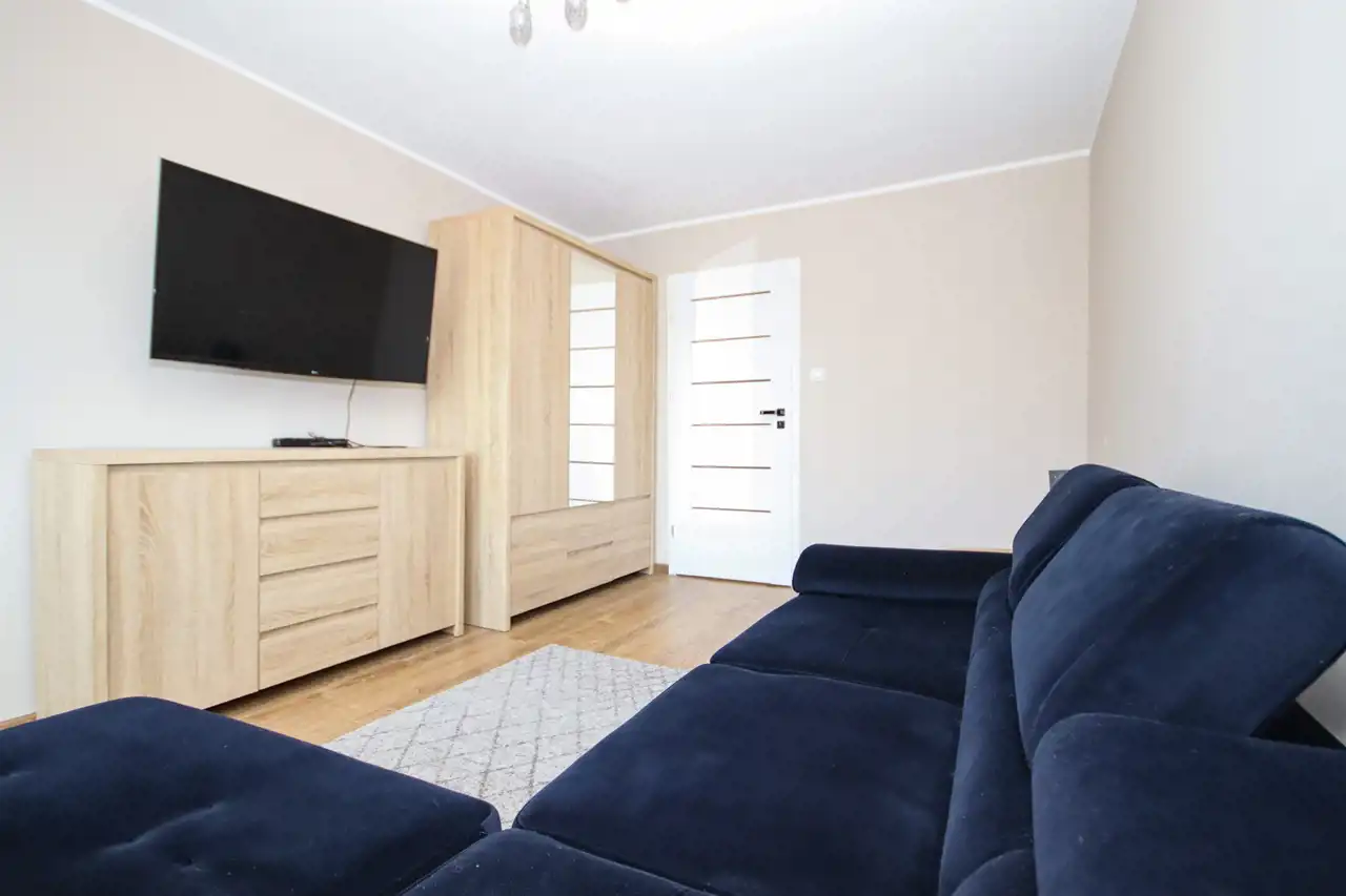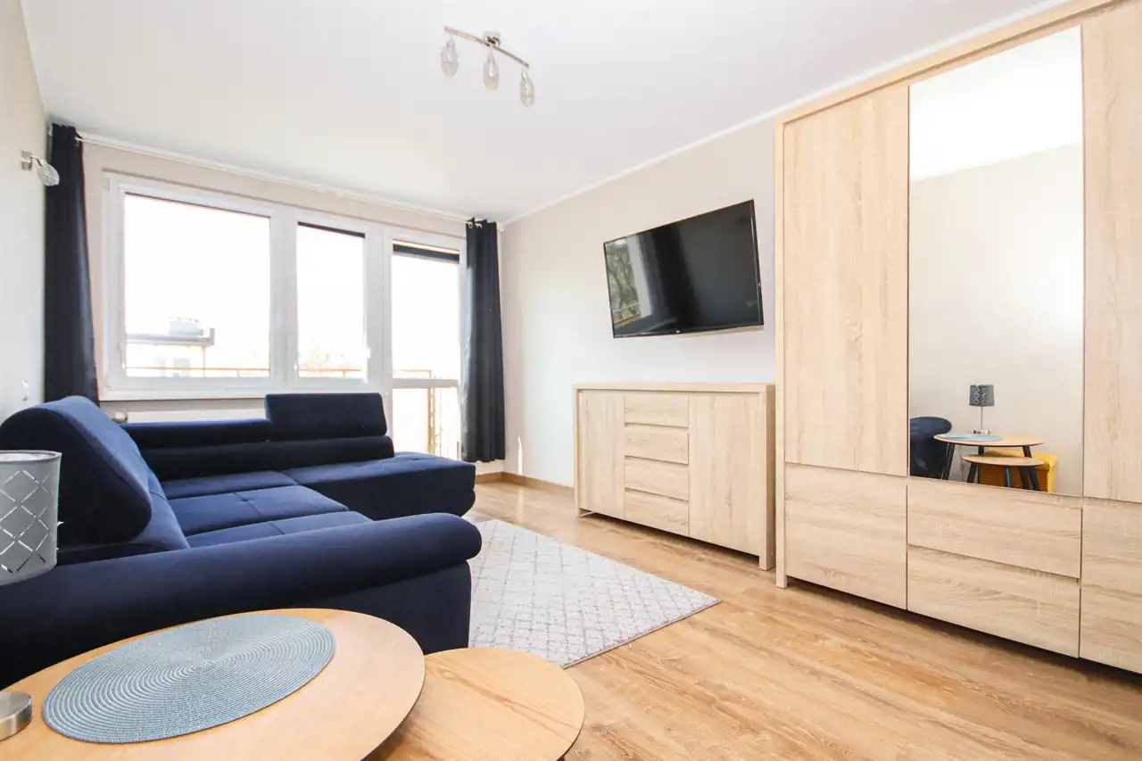 Salon jest przestronny i jasny, wyposażony w dużą sofę narożną, telewizor, komodę oraz pojemną szafę. Duże okna zapewniają doskonałe doświetlenie wnętrza.