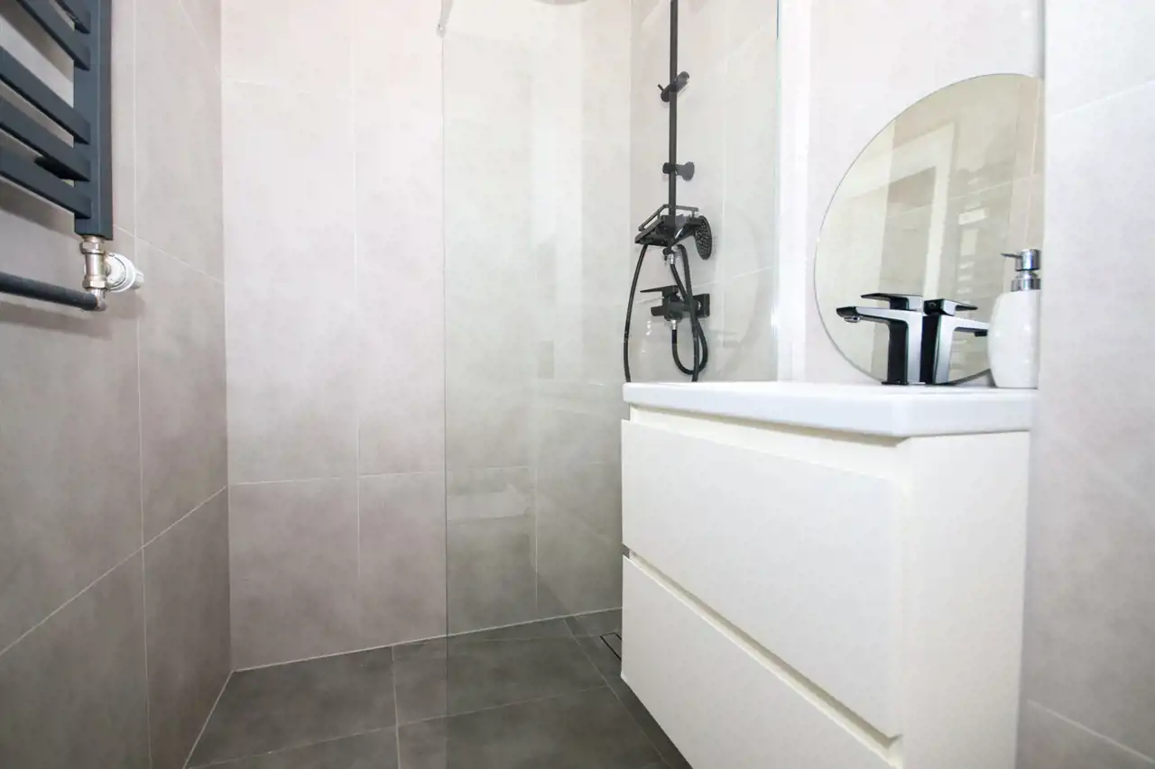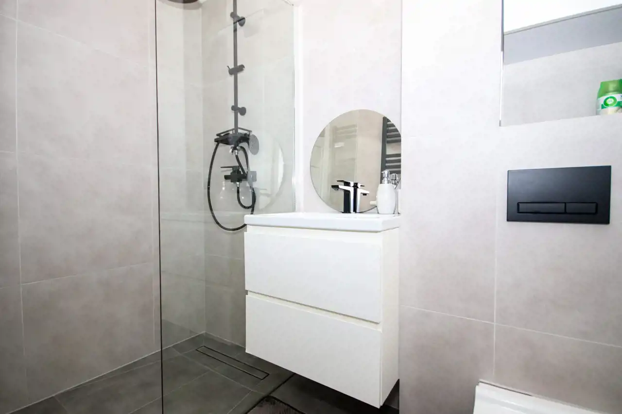 Łazienka wykończona z dbałością o detale – znajduje się w niej kabina prysznicowa z odpływem liniowym, WC oraz umywalka z szafką. Całość utrzymana w nowoczesnym, estetycznym stylu.