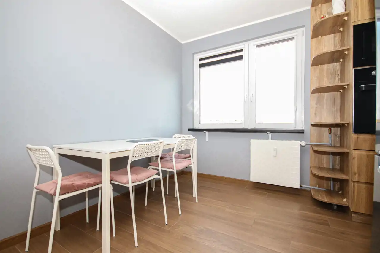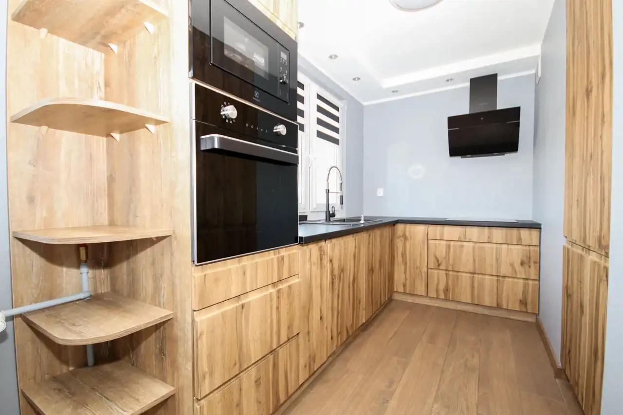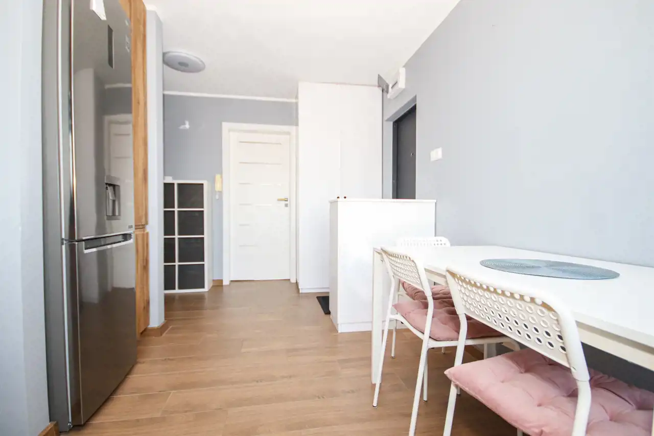 Kuchnia została zaprojektowana w nowoczesnym stylu i wyposażona w sprzęty AGD: lodówkę, piekarnik, mikrofalówkę oraz zmywarkę. Jasna i ergonomiczna przestrzeń zapewnia komfort gotowania i codziennego użytkowania.