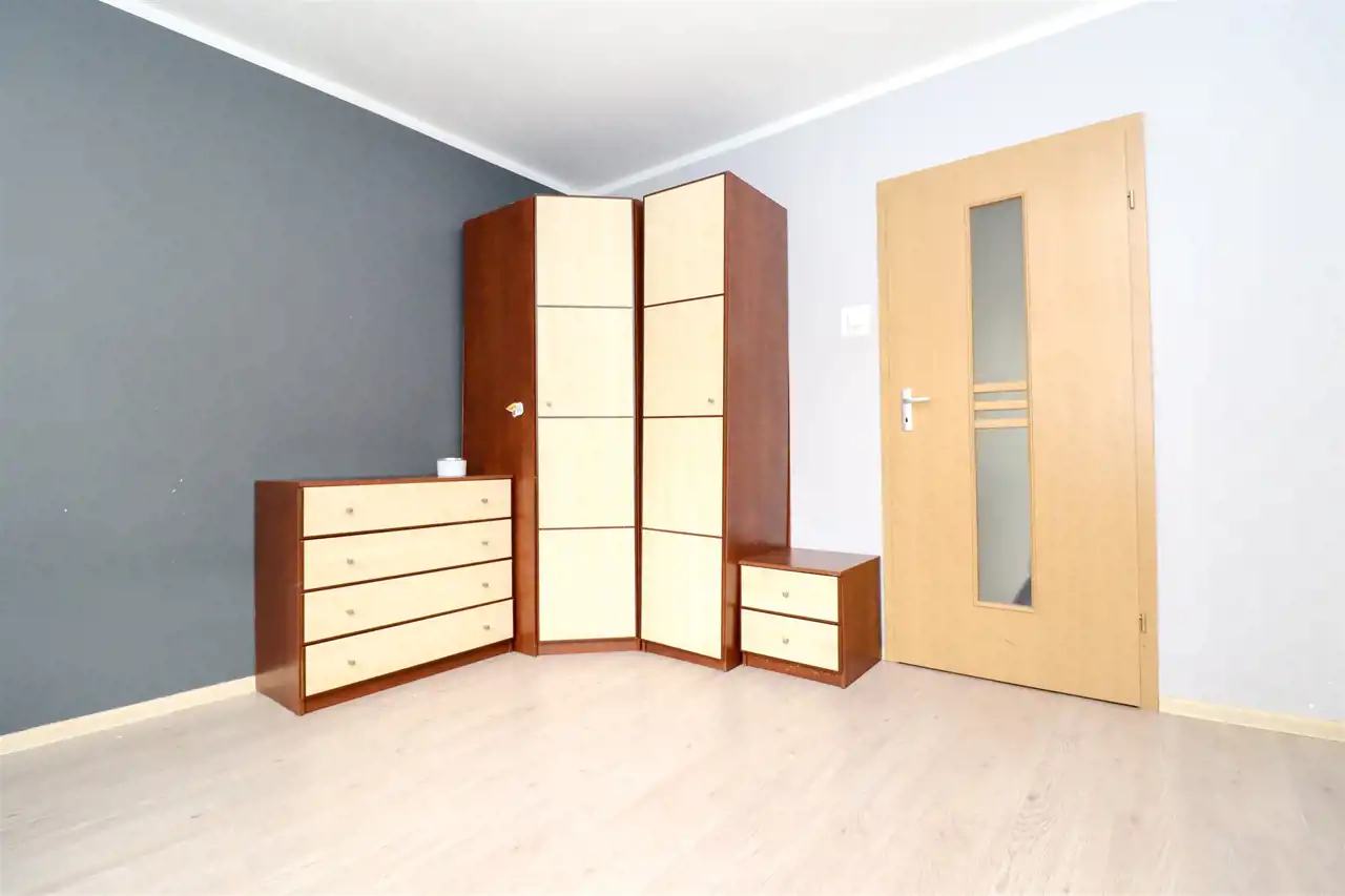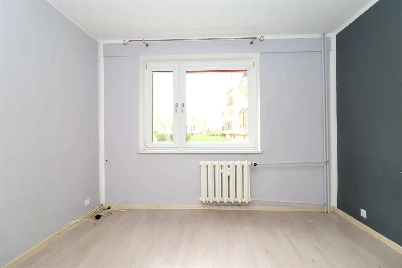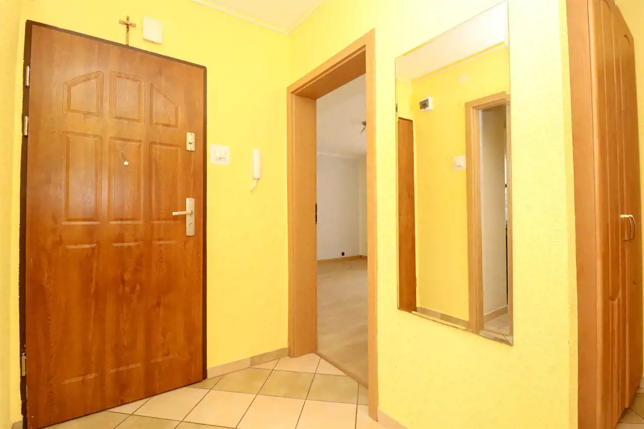 Do mieszkania przedostajemy się z czystej klatki schodowej. W korytarzu znajduje się pakowna szafa, na podłodze kafelki. Do dyspozycji 3 pokoje, z największego wyjście na duży balkon, to bardzo ustawne pomieszczenie, idealnie spełniające swoją funkcję. W pokoju dziennym na podłodze panele zwieńczone listwami. W oknach zamontowano rolety. Kuchnia z widokiem na piękny, zielony park. Wyposażona w podstawową zabudowę kuchenną wraz ze sprzętem tj.: kuchenka gazowa, piekarnik oraz okap kuchenny. W pozostałych pokojach na podłogach znajdują się panele. Łazienka oraz WC wyłożona glazurą i terakotą, wyposażona w wannę, szafkę z umywalką oraz toaletę. Mieszkanie częściowo umeblowane.