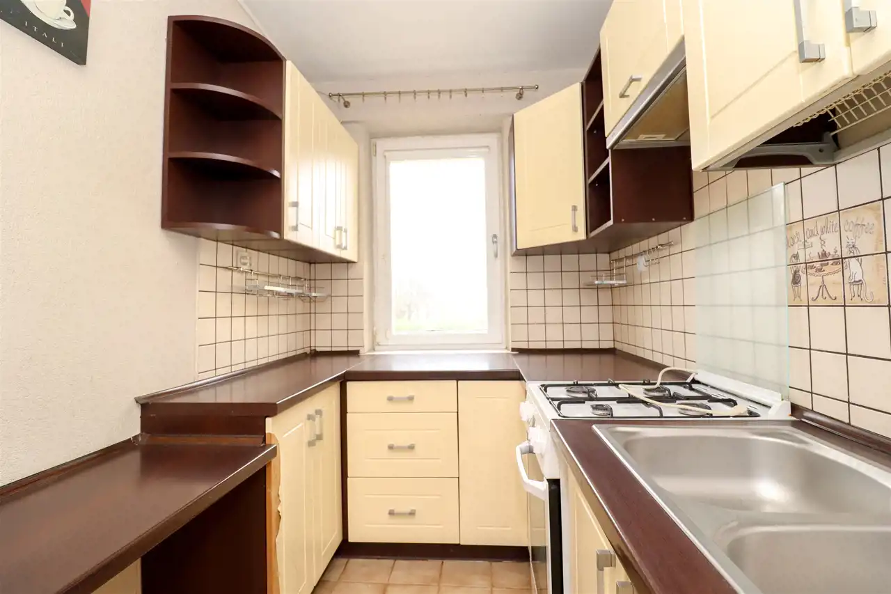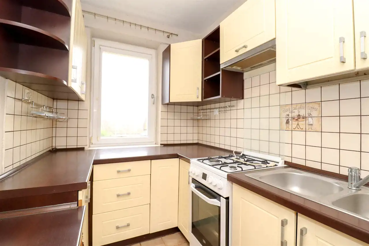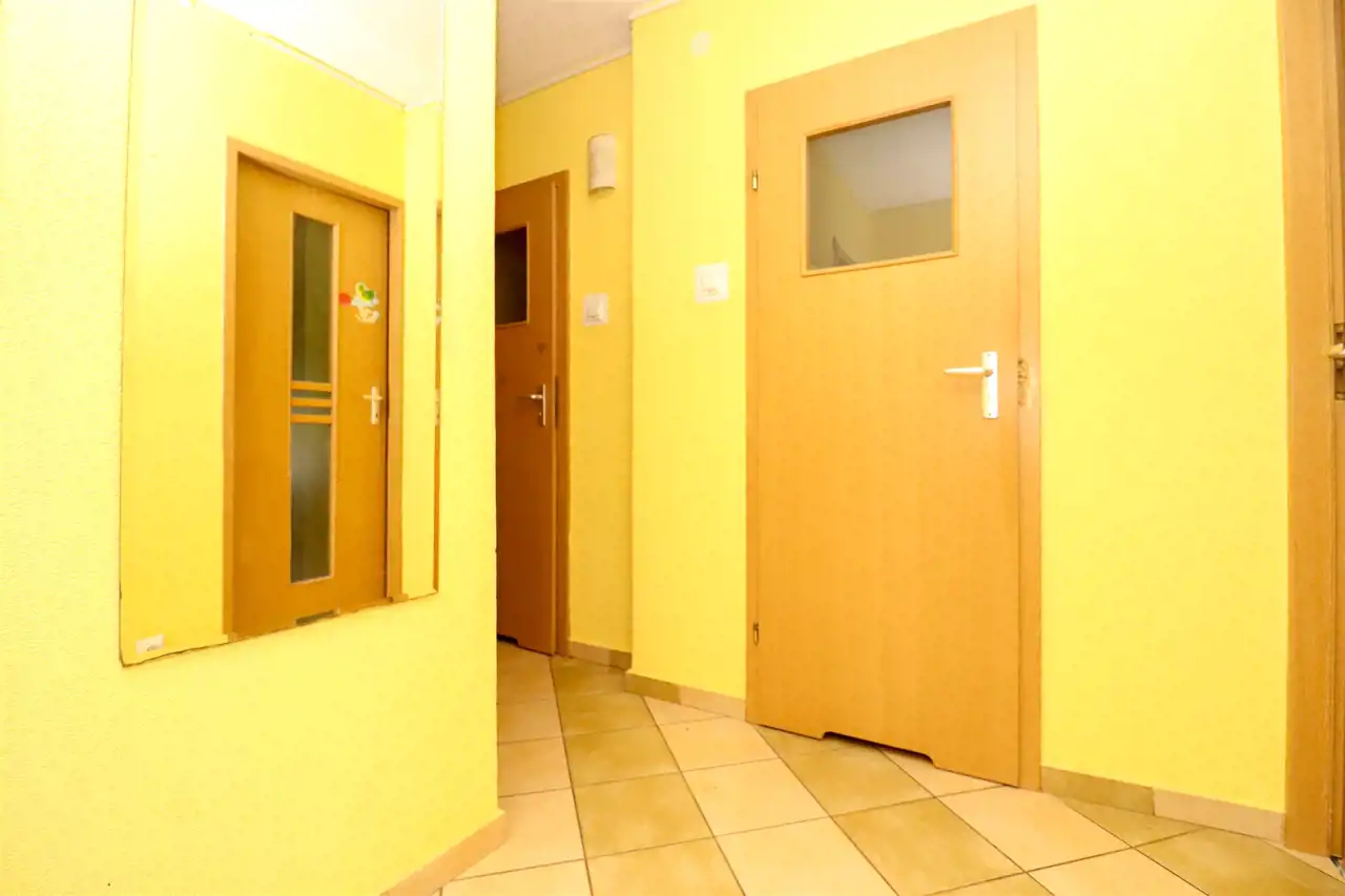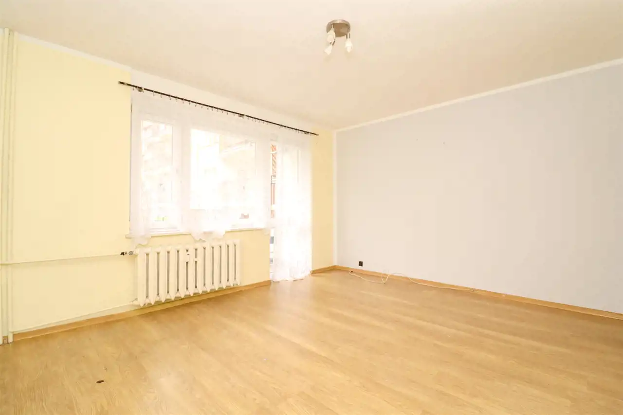 Do mieszkania przedostajemy się z czystej klatki schodowej. W korytarzu znajduje się pakowna szafa, na podłodze kafelki. Do dyspozycji 3 pokoje, z największego wyjście na duży balkon, to bardzo ustawne pomieszczenie, idealnie spełniające swoją funkcję. W pokoju dziennym na podłodze panele zwieńczone listwami. W oknach zamontowano rolety. Kuchnia z widokiem na piękny, zielony park. Wyposażona w podstawową zabudowę kuchenną wraz ze sprzętem tj.: kuchenka gazowa, piekarnik oraz okap kuchenny. W pozostałych pokojach na podłogach znajdują się panele. Łazienka oraz WC wyłożona glazurą i terakotą, wyposażona w wannę, szafkę z umywalką oraz toaletę. Mieszkanie częściowo umeblowane.