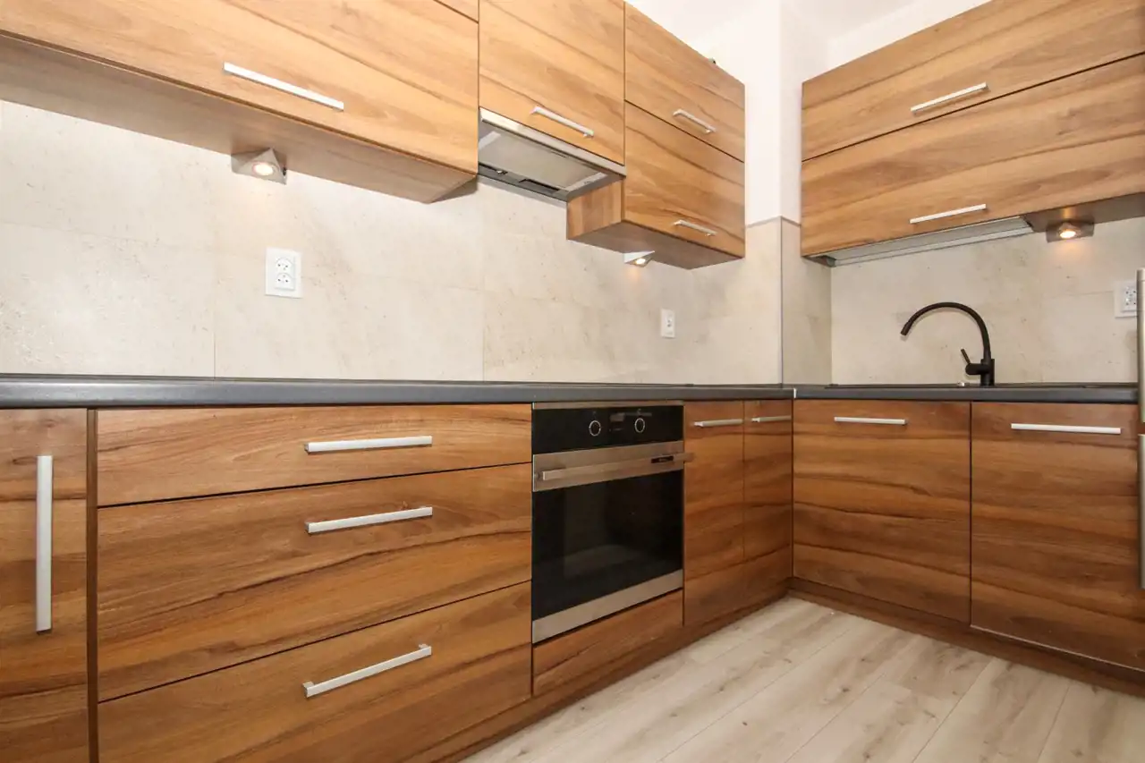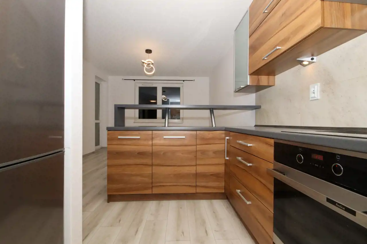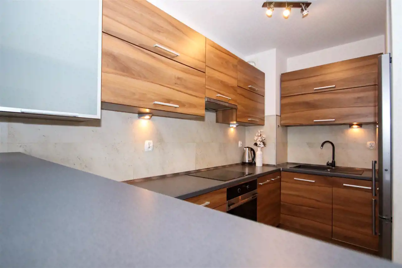 Przestronny pokój dzienny naturalnie łączy część wypoczynkową z wygodnym aneksem kuchennym. Kuchnia wyposażona jest w pełną zabudowę meblową oraz sprzęt AGD: płytę grzewczą, piekarnik, lodówkę, zmywarkę i pochłaniacz.