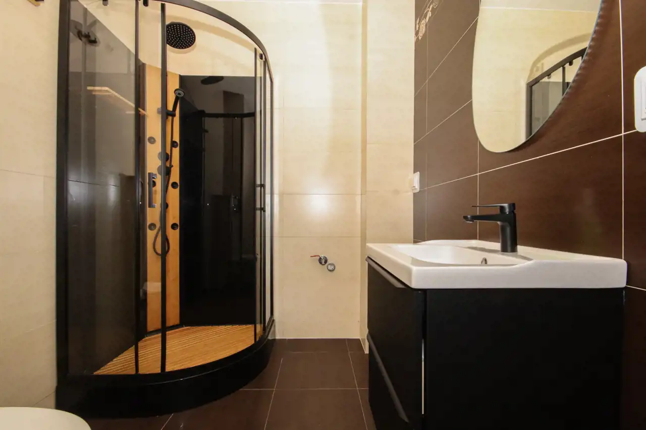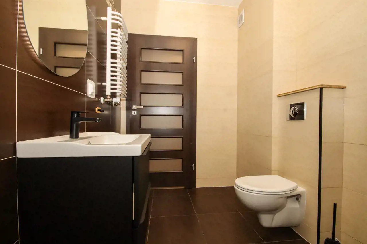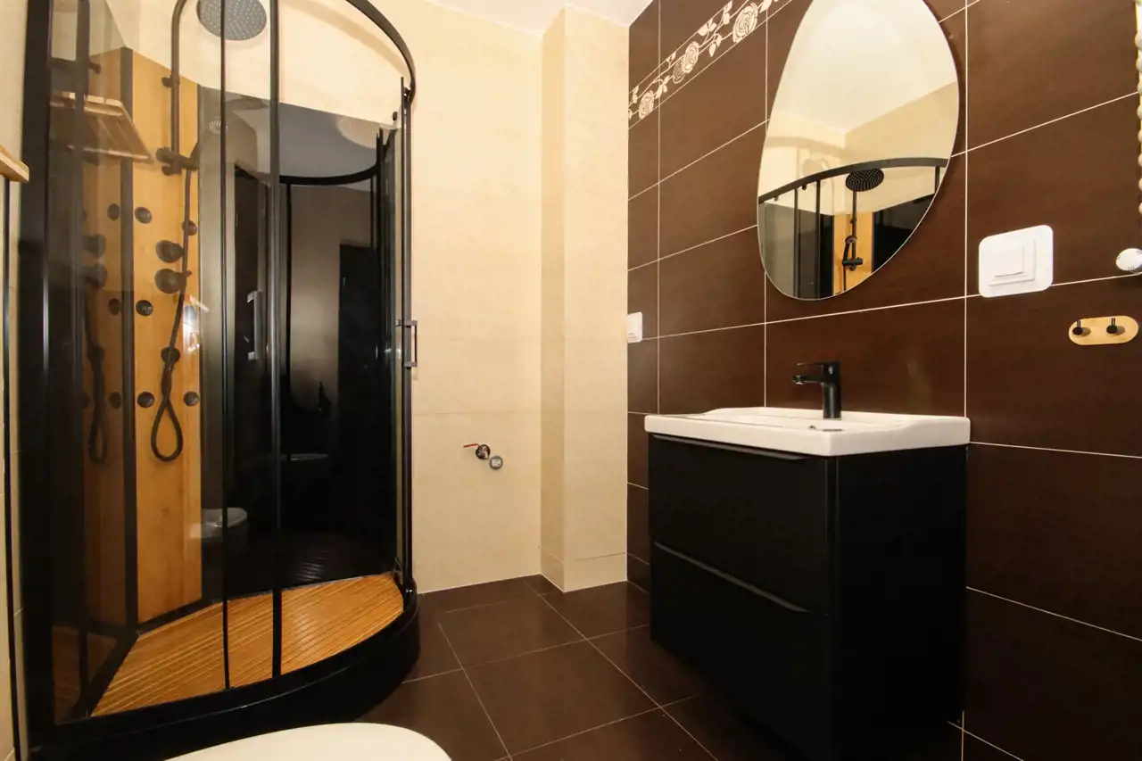 Łazienka utrzymana w ciepłej estetyce brązu i beżu. Znajduje się tu toaleta, umywalka w zabudowie oraz nowo zamontowana kabina prysznicowa.