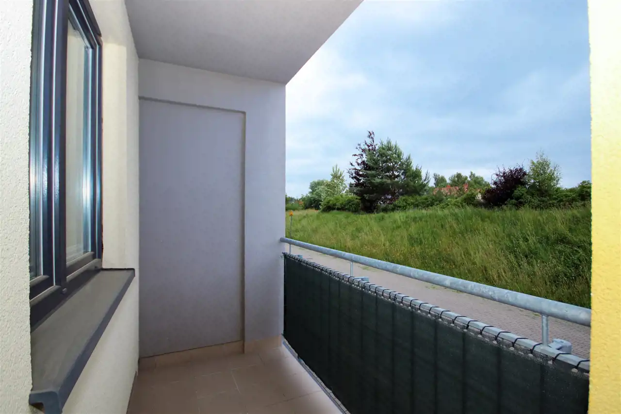 Z salonu prowadzi wyjście na balkon z widokiem na zieleń i zabudowę jednorodzinną, co zapewnia ciszę, prywatność i relaks po pracy.
