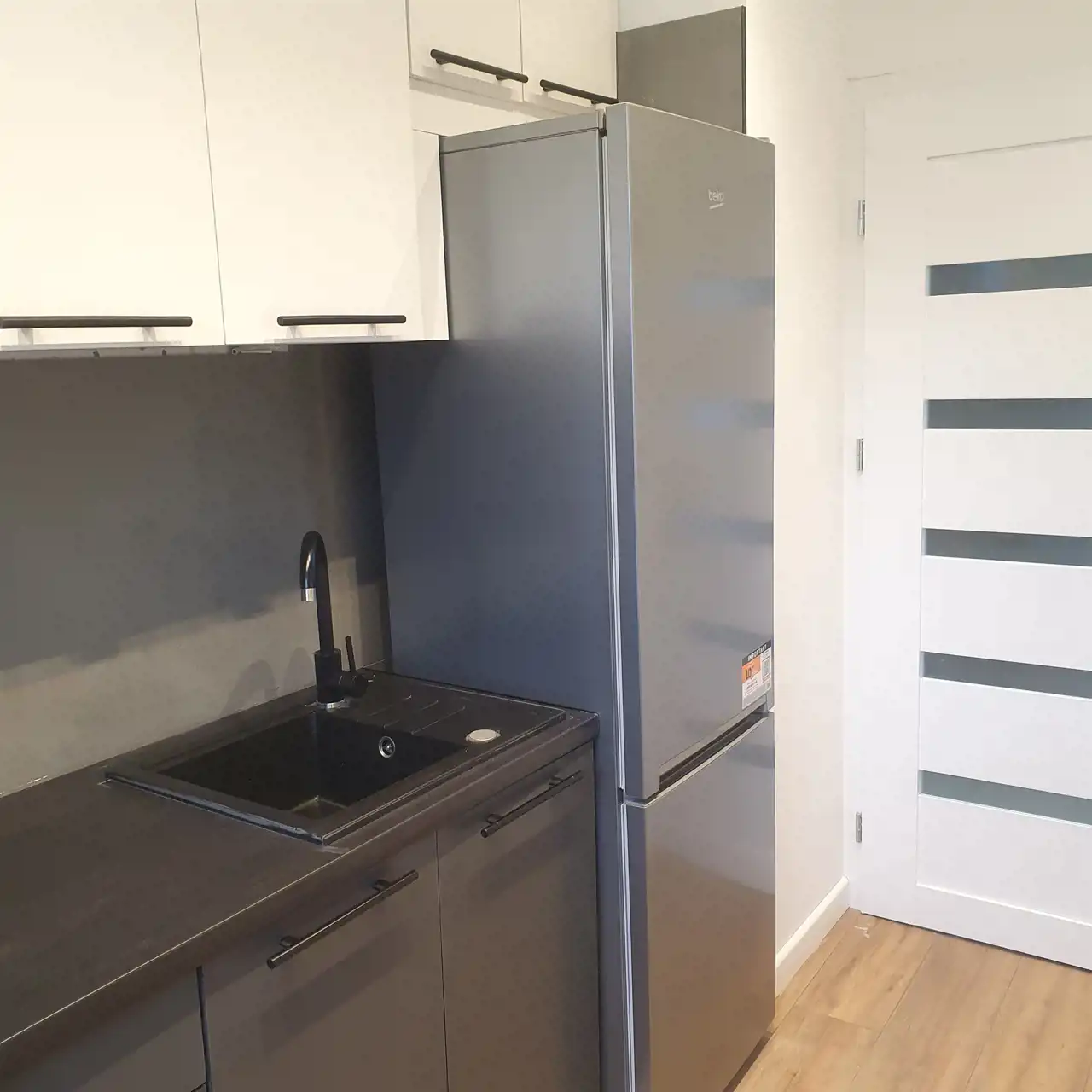 W cenie mieszkania pozostają nowe meble kuchenne wykonane na indywidualne zamówienie oraz sprzęty agd widoczne na zdjęciach, takie jak okap, zlew, płyta indukcyjna, lodówka oraz piekarnik w zabudowie.