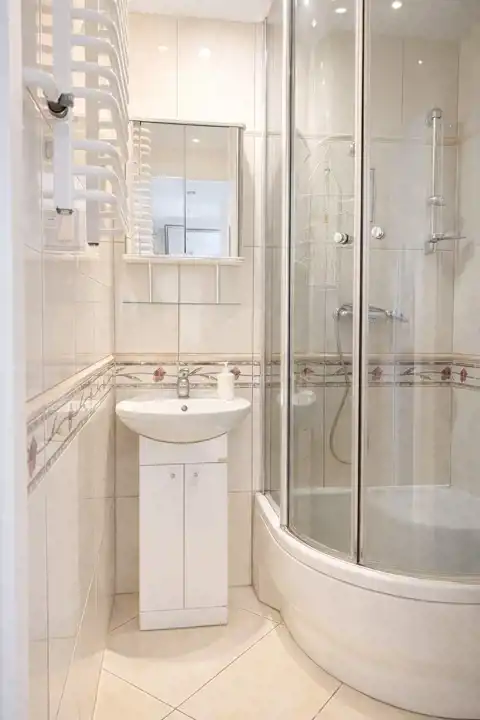- Łazienka z kabiną prysznicową i miejscem na pralkę.