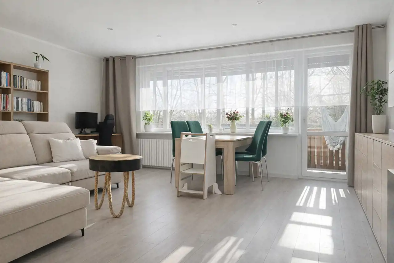- Komfortowa przestrzeń zewnętrzna: Z salonu wyjście na dużą, słoneczną loggię – idealne miejsce na poranną kawę.