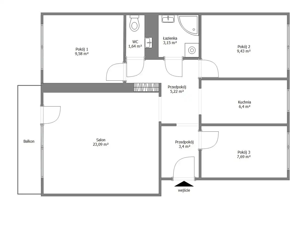 - Łazienka (z prysznicem i pralką) – 3,15 m²