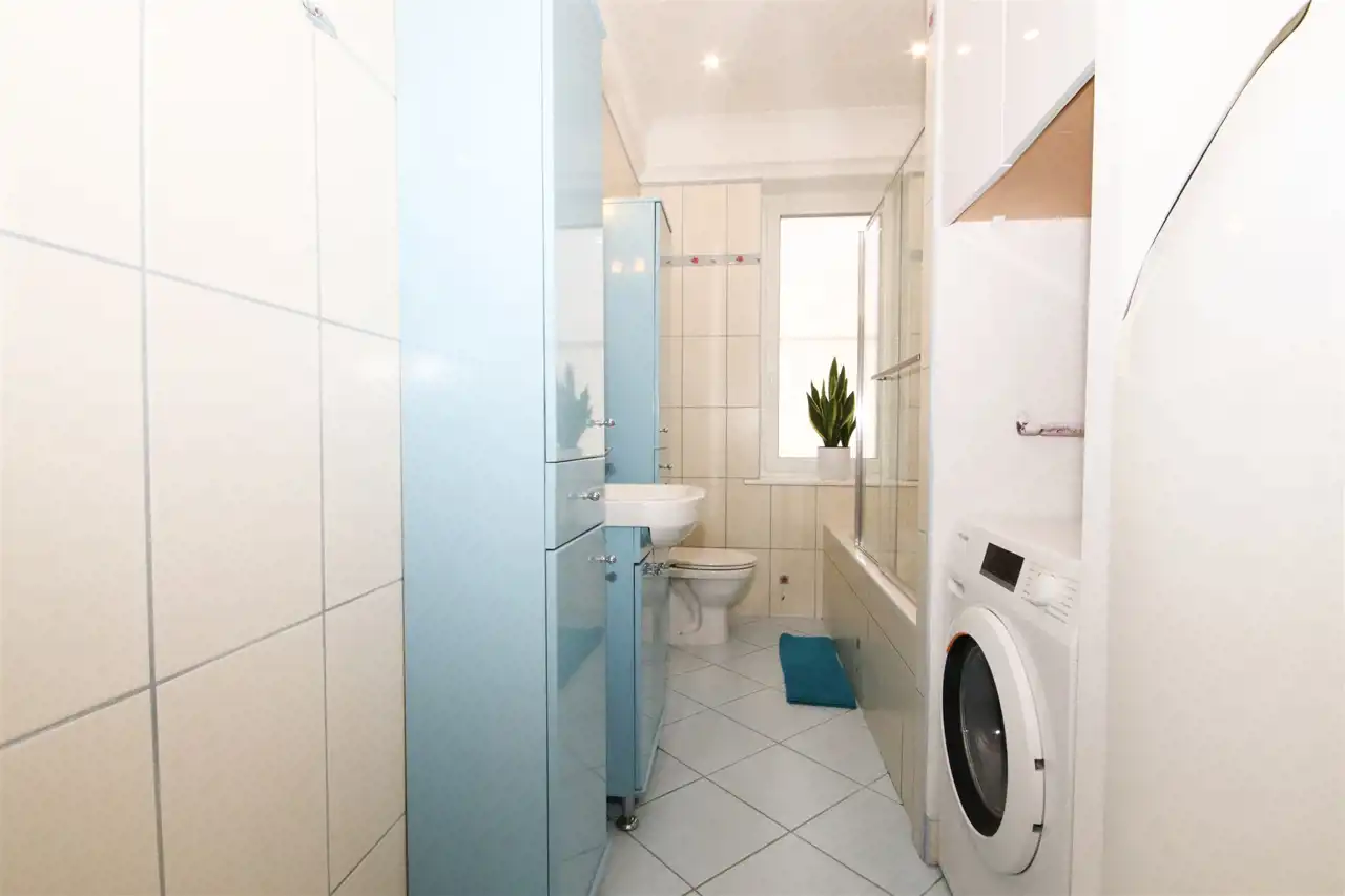 - nowoczesnej, dużej łazienki z oknem, wyposażonej w wannę z parawanem prysznicowym, miejscem na pralkę oraz szafą w zabudowie.