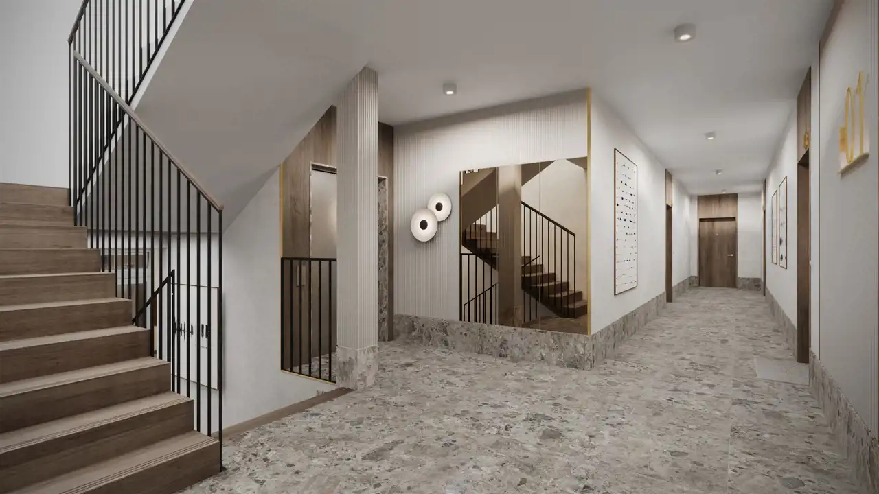 - Szerokie klatki schodowe z cichobieżnymi windami