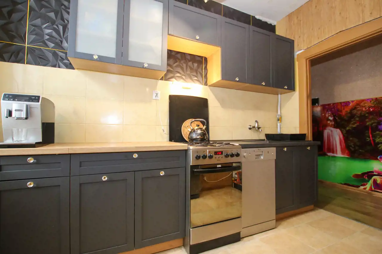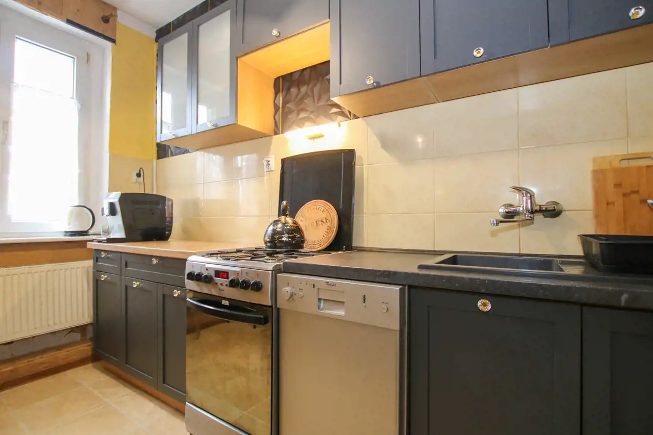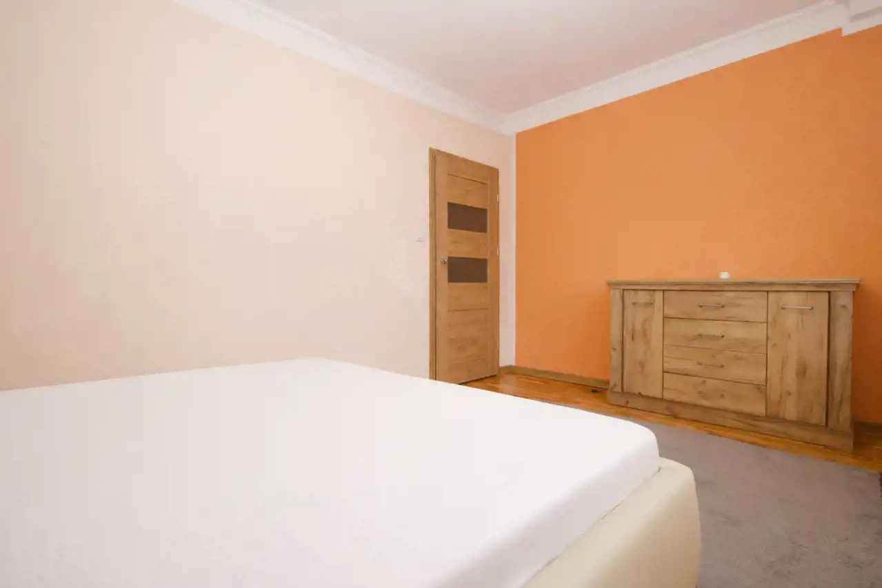 Jeden z pokoi został urządzony w jasnej, energetycznej kolorystyce i wyposażony m.in. w dużą szafę w zabudowie, biurko oraz sofę. Sypialnia jest przytulna i estetyczna, z dużym łóżkiem, stolikami nocnymi i komodą. Kuchnia oferuje funkcjonalną zabudowę meblową oraz miejsce na niezbędny sprzęt AGD. Łazienka wyposażona jest w narożną wannę z przesłoną prysznicową, umywalkę, toaletę i pralkę.