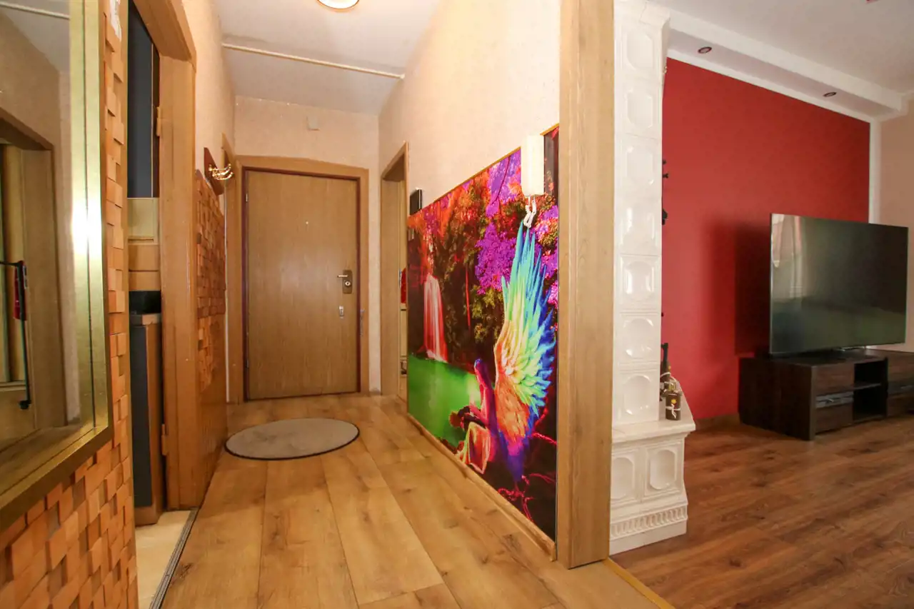 Wnętrza mieszkania są jasne, przestronne i urządzone w ciepłej, wyrazistej stylistyce. Salon z jadalnią tworzy komfortową strefę dzienną — znajduje się tu komplet wypoczynkowy, stolik kawowy, szafka RTV, część jadalniana z dużym stołem oraz ozdobny piec kaflowy. Charakter wnętrzu nadają dekoracyjne czerwone akcenty i drewniane elementy wykończenia.