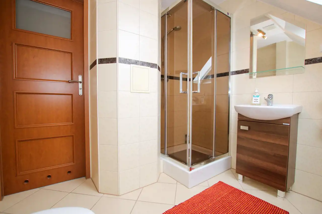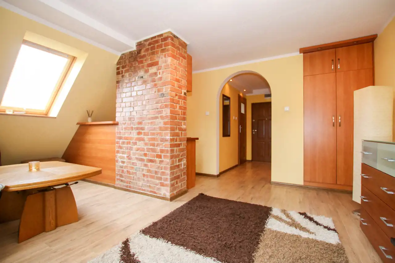 Na poddaszu znajduje się samodzielna kawalerka z łazienką, która może stanowić świetne miejsce do zamieszkania dla członka rodziny, gości albo być wykorzystana jako dodatkowa przestrzeń do wynajmu.